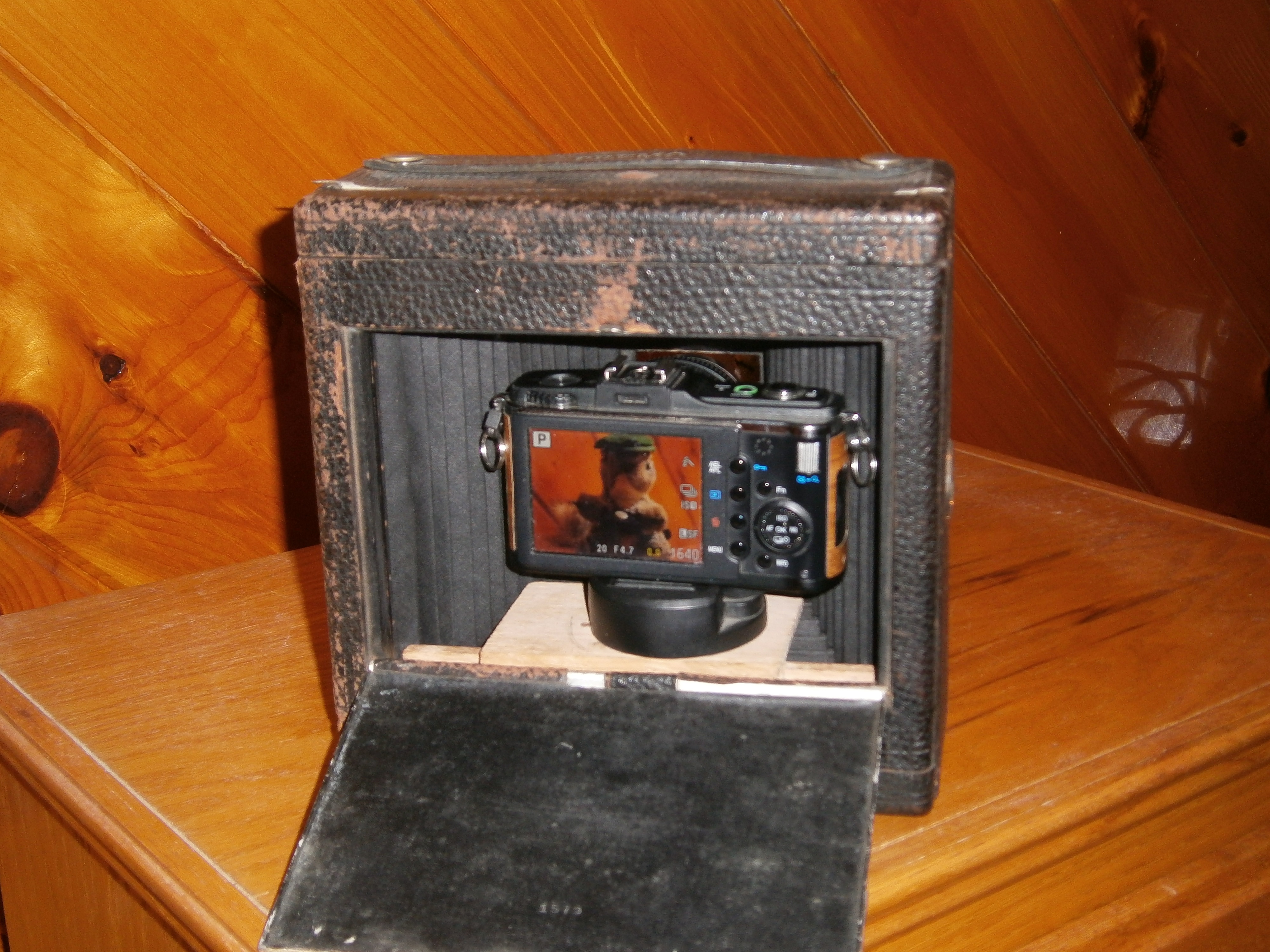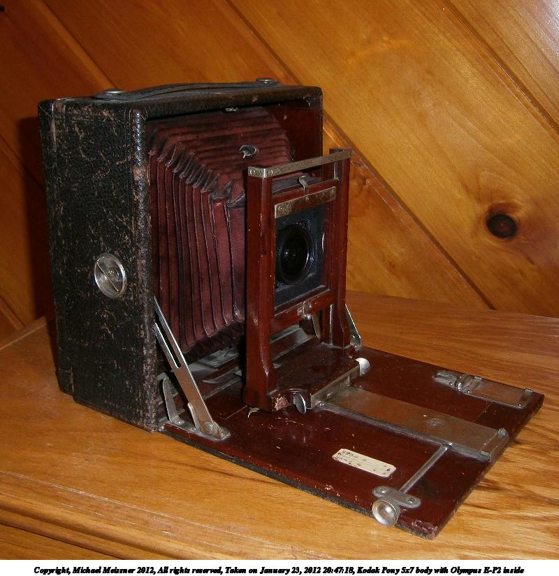 Picture #45: Kodak Pony 5x7 body with Olympus E-P2 inside Small: 600x846, 98,402 bytes (97K), (html file) Large: 1800x2400, 2,571,848 bytes (2.5M), (html file) Copyright, Michael Meissner 2012, All rights reserved Olympus VG-120 camera f/2.8, ISO 125, flash, 1/30 sec, 4.7mm, auto mode, HQ, center weight metering 35mm equivalent focal length 26.0mm Programs used: gimp, raw therapee Taken by Michael Meissner on January 23, 2012 20:47:02 Last modified on January 23, 2012 at 21:26 |