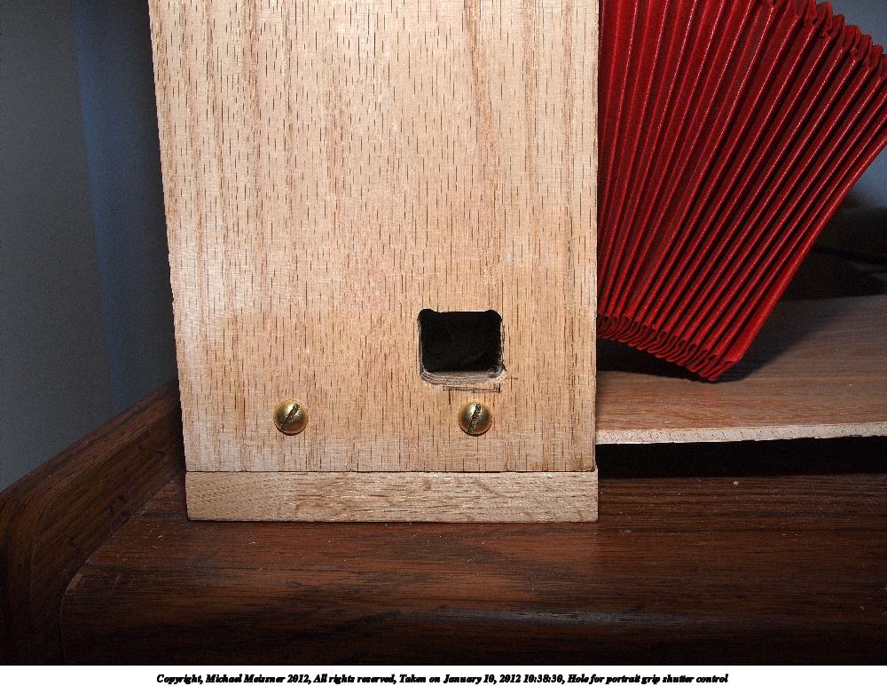 Picture #57: Hole for portrait grip shutter control Small: 1000x773, 167,328 bytes (164K), (html file) Large: 4000x3000, 4,853,189 bytes (4.6M), (html file) Copyright, Michael Meissner 2012, All rights reserved Olympus E-P2 camera with Panasonic 20mm lens f/8.0, ISO 200, FL-36 flash (+0.33 flash compensation), 1/60 sec, 20.0mm, aperture priority, vivid color, SHQ, spot metering, IS1 (All Direction Shake IS), noise reduction auto, noise filter low 35mm equivalent focal length 40.0mm Extra equipment used: Olympus FL-36 flash Programs used: raw therapee Taken by Michael Meissner on January 10, 2012 10:38:30 Last modified on January 11, 2012 at 10:14 |