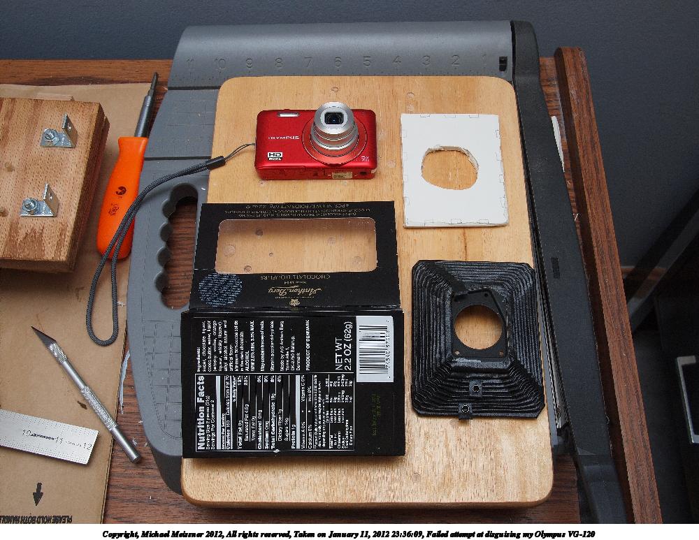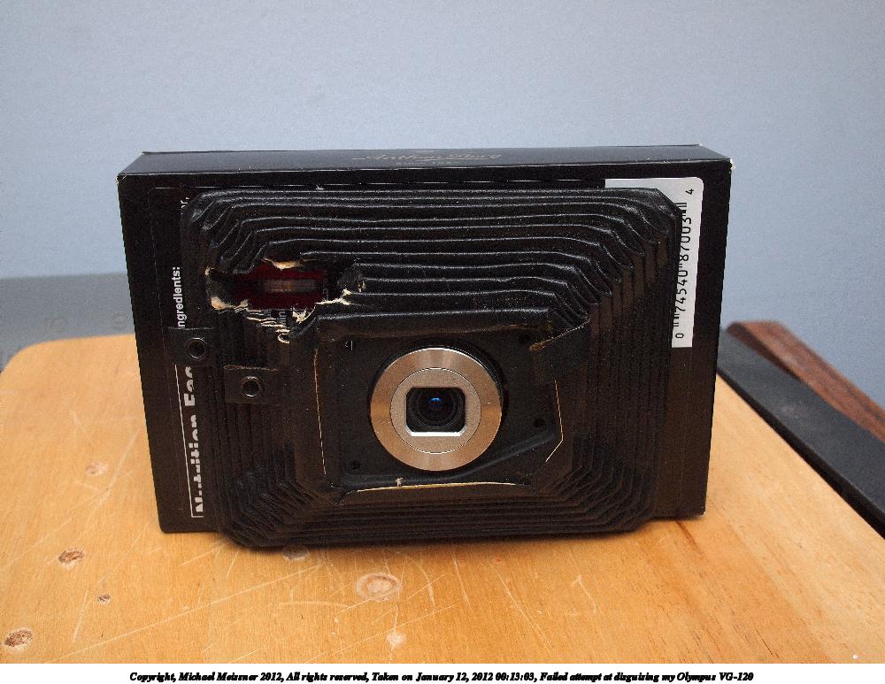 Picture #32: VG-120 with front cover Small: 1000x773, 160,992 bytes (158K), (html file) Large: 4000x3000, 4,606,537 bytes (4.4M), (html file) Copyright, Michael Meissner 2012, All rights reserved Olympus E-P2 camera with Olympus-m43 14-42mm f/3.5-5.6 lens f/8.0, ISO 200, FL-36 flash (+0.33 flash compensation), 1/60 sec, 29.0mm, aperture priority, vivid color, SHQ, matrix metering, IS1 (All Direction Shake IS), noise reduction auto, noise filter low 35mm equivalent focal length 58.0mm Extra equipment used: Olympus FL-36 flash Programs used: crop, raw therapee Taken by Michael Meissner on March 12, 2012 23:11:26 Last modified on March 13, 2012 at 00:34 |