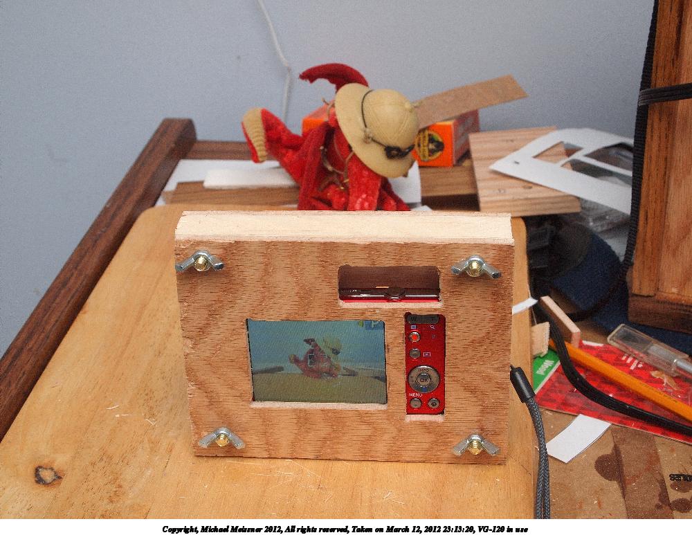 Picture #36: Olympus VG-120 in pine frame Small: 1000x773, 112,938 bytes (111K), (html file) Large: 4000x3000, 3,814,745 bytes (3.6M), (html file) Copyright, Michael Meissner 2012, All rights reserved Olympus E-P2 camera with Olympus-m43 14-42mm f/3.5-5.6 lens f/8.0, ISO 200, FL-36 flash (+0.33 flash compensation), 1/60 sec, 29.0mm, aperture priority, vivid color, SHQ, matrix metering, IS1 (All Direction Shake IS), noise reduction auto, noise filter low 35mm equivalent focal length 58.0mm Extra equipment used: Olympus FL-36 flash Programs used: crop, raw therapee Taken by Michael Meissner on March 09, 2012 10:19:48 Last modified on March 13, 2012 at 00:31 |