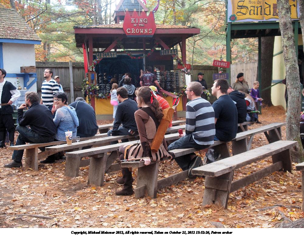 Picture #27: Patron archer Small: 1000x773, 223,523 bytes (219K), (html file) Large: 4000x3000, 4,544,857 bytes (4.3M), (html file) Copyright, Michael Meissner 2012, All rights reserved Olympus E-5 camera with Olympus 14-54mm f/2.8-3.5 lens f/3.0, ISO 400, 1/60 sec, 23.0mm, auto mode, vivid color, matrix metering, IS1 (All Direction Shake IS) 35mm equivalent focal length 46.0mm Programs used: crop, raw therapee Taken by Michael Meissner on October 21, 2012 15:52:26 Last modified on July 22, 2013 at 09:29 |