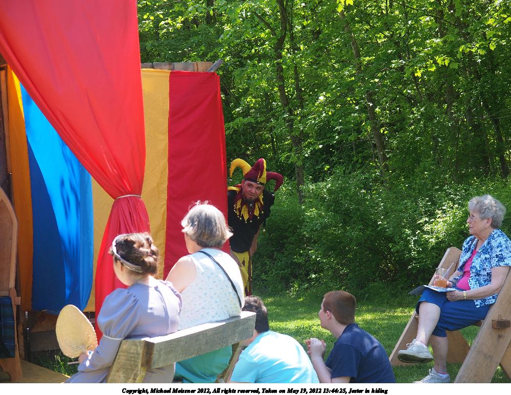 Picture #7: Jester in hiding Small: 1000x773, 208,550 bytes (204K), (html file) Large: 4000x3000, 4,353,621 bytes (4.2M), (html file) Copyright, Michael Meissner 2012, All rights reserved Olympus E-5 camera with Olympus 14-54mm f/2.8-3.5 lens f/4.5, ISO 200, 1/200 sec, 49.0mm, auto mode, vivid color, matrix metering, IS1 (All Direction Shake IS) 35mm equivalent focal length 98.0mm Programs used: crop, raw therapee Taken by Michael Meissner on May 19, 2012 13:44:25 Last modified on May 16, 2013 at 22:29 |