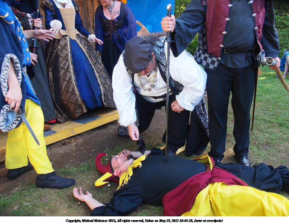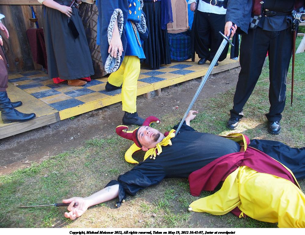 Picture #2: Jester at swordpoint Small: 1000x773, 216,206 bytes (212K), (html file) Large: 4000x3000, 4,501,325 bytes (4.3M), (html file) Copyright, Michael Meissner 2012, All rights reserved Olympus E-5 camera with Olympus 14-54mm f/2.8-3.5 lens f/3.2, ISO 200, 1/100 sec, 14.0mm, auto mode, vivid color, matrix metering, IS1 (All Direction Shake IS) 35mm equivalent focal length 28.0mm Programs used: crop, raw therapee Taken by Michael Meissner on May 19, 2012 16:41:07 Last modified on May 16, 2013 at 22:55 |