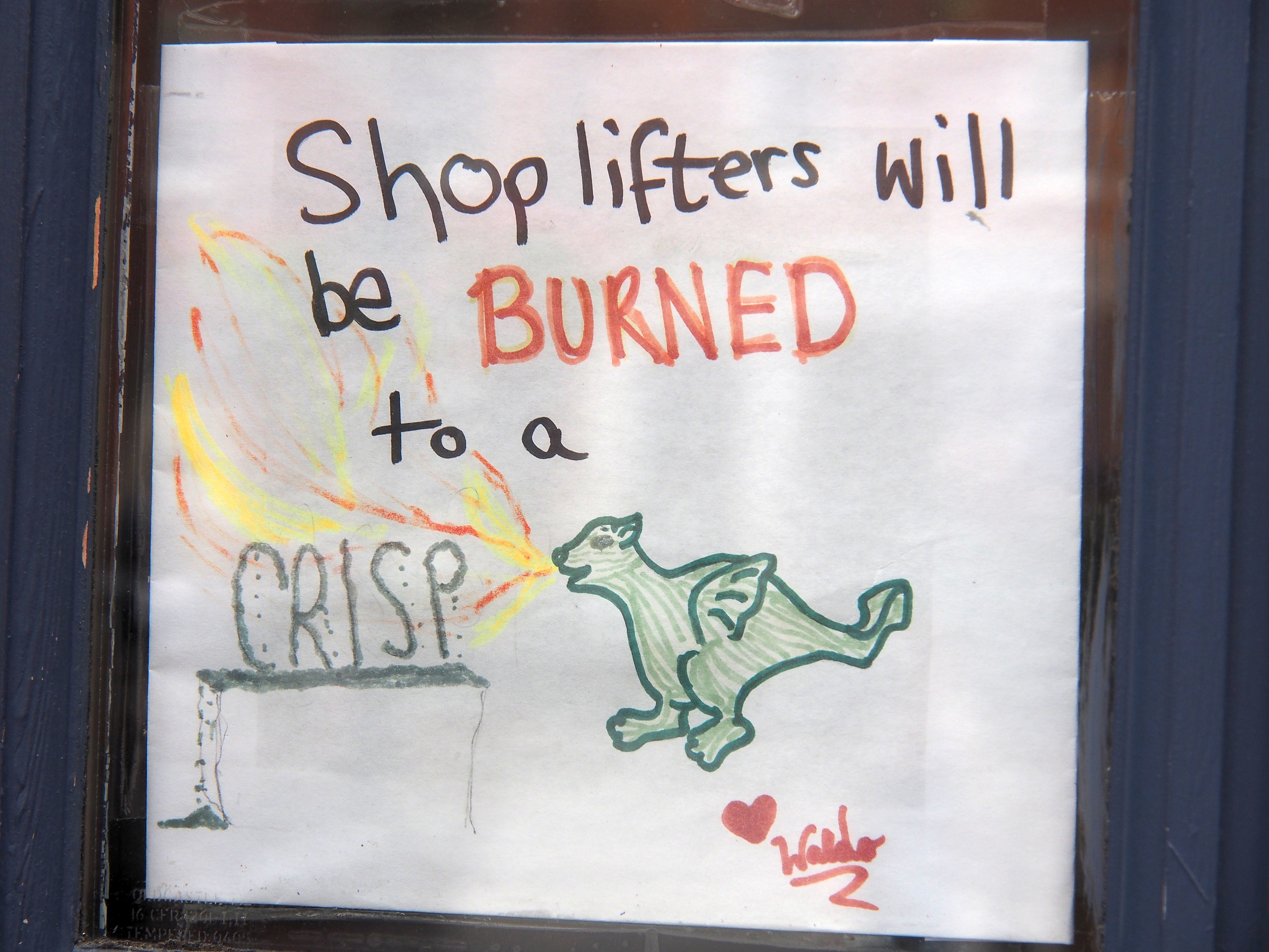 Picture #47: Shoplifters will be burned Small: 920x713, 101,445 bytes (100K), (html file) Large: 4600x3450, 3,784,255 bytes (3.6M), (html file) Copyright, Michael Meissner 2012, All rights reserved Olympus E-M5-I camera with Olympus-m43 14-150mm f/4.0-5.6 lens f/7.1, ISO 200, 1/250 sec, 70.0mm, auto mode, vivid color, HQ, matrix metering, IS1 (All Direction Shake IS), noise reduction auto 35mm equivalent focal length 140.0mm Programs used: crop, raw therapee Taken by Michael Meissner on May 26, 2012 10:26:15 Last modified on January 13, 2013 at 21:05 |