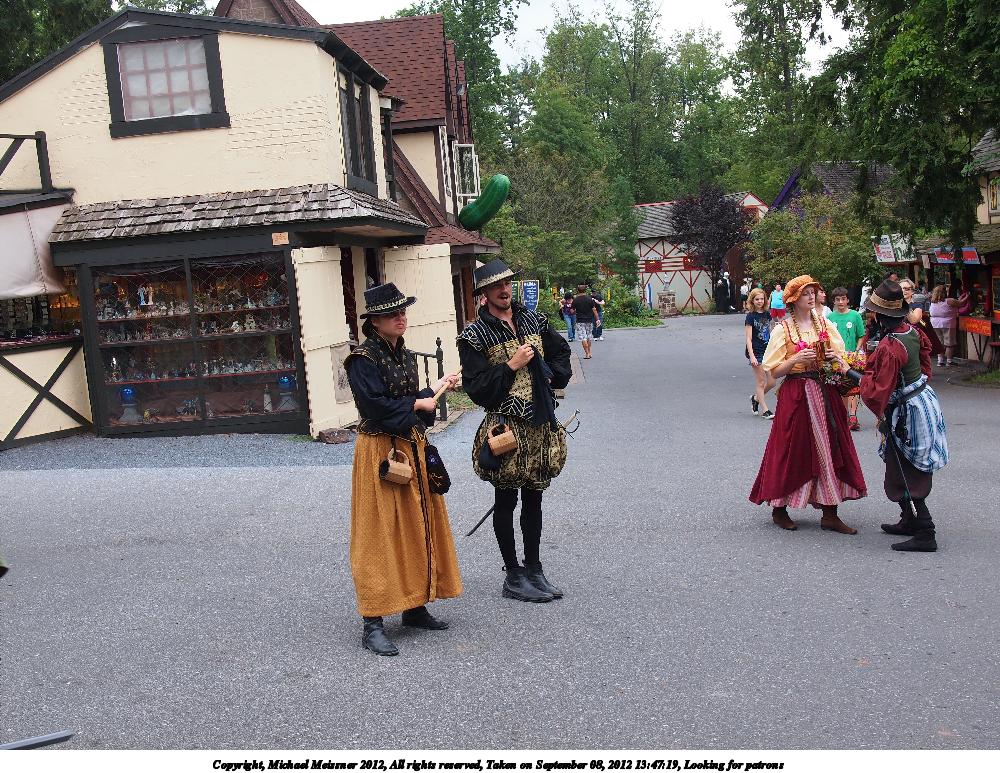 Picture #2: Looking for patrons Thumb: 500x375, 56,308 bytes (55K) Small: 1000x773, 238,596 bytes (234K), (html file) Large: 4000x3000, 4,731,117 bytes (4.5M), (html file) Copyright, Michael Meissner 2012, All rights reserved Olympus E-5 camera with Olympus 14-54mm f/2.8-3.5 lens f/4.5, ISO 200, 1/160 sec, 22.0mm, auto mode, vivid color, matrix metering, IS1 (All Direction Shake IS) 35mm equivalent focal length 44.0mm Programs used: crop, raw therapee Taken by Michael Meissner on September 08, 2012 13:47:19 Last modified on July 21, 2013 at 23:24 |