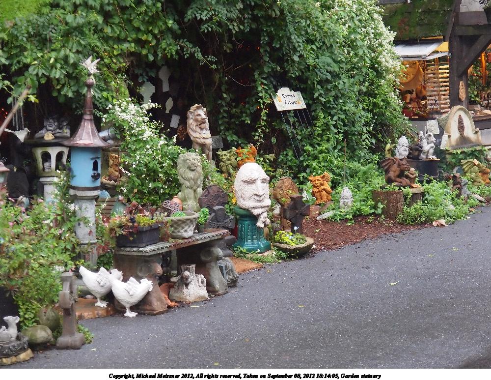 Picture #2: Garden statuary Thumb: 500x375, 67,265 bytes (66K) Small: 1000x773, 235,037 bytes (230K), (html file) Large: 4000x3000, 4,653,334 bytes (4.4M), (html file) Copyright, Michael Meissner 2012, All rights reserved Olympus E-5 camera with Olympus 14-54mm f/2.8-3.5 lens f/3.4, ISO 2000, 1/250 sec, 47.0mm, shutter priority, vivid color, matrix metering, IS1 (All Direction Shake IS) 35mm equivalent focal length 94.0mm Programs used: crop, noiseninja, raw therapee Taken by Michael Meissner on September 08, 2012 18:14:05 Last modified on July 21, 2013 at 23:51 |