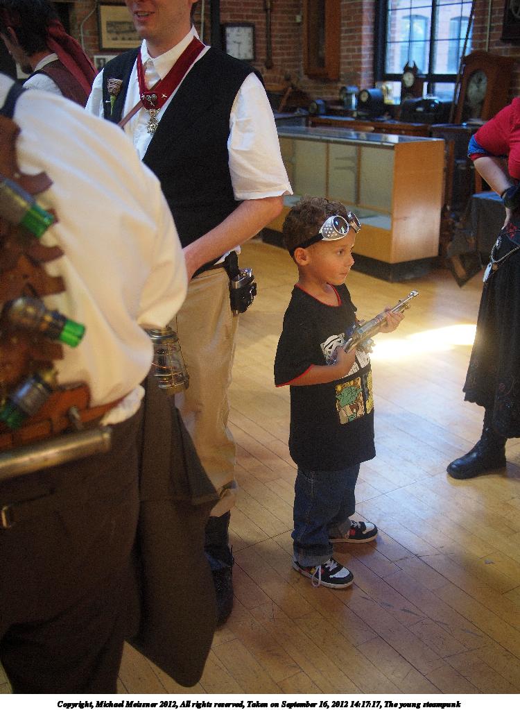 Picture #46: The young steampunk Small: 750x1023, 128,580 bytes (126K), (html file) Large: 3000x4000, 4,007,666 bytes (3.8M), (html file) Copyright, Michael Meissner 2012, All rights reserved Olympus E-P2 camera with Panasonic 20mm lens f/1.7, ISO 250, 1/60 sec, 20.0mm, auto mode, vivid color, matrix metering, IS1 (All Direction Shake IS), noise filter low 35mm equivalent focal length 40.0mm Programs used: crop, raw therapee, rotate left Taken by Michael Meissner on September 16, 2012 14:17:17 Last modified on January 13, 2013 at 23:26 |