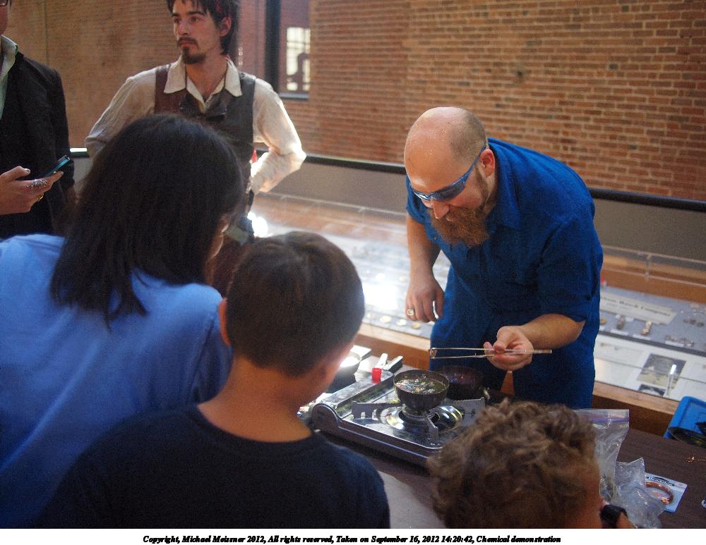 Picture #47: Chemical demonstrations Small: 1000x773, 143,688 bytes (141K), (html file) Large: 4000x3000, 4,115,098 bytes (3.9M), (html file) Copyright, Michael Meissner 2012, All rights reserved Olympus E-P2 camera with Panasonic 20mm lens f/1.8, ISO 400, 1/60 sec, 20.0mm, auto mode, vivid color, matrix metering, IS1 (All Direction Shake IS), noise filter low 35mm equivalent focal length 40.0mm Programs used: crop, raw therapee Taken by Michael Meissner on September 16, 2012 14:16:01 Last modified on January 13, 2013 at 23:25 |