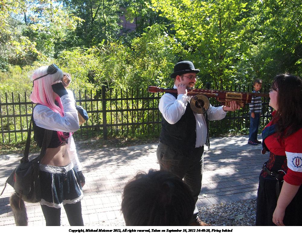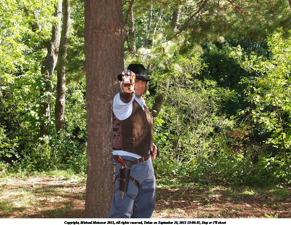 Picture #35: Stop or I'll shoot Small: 1000x773, 345,696 bytes (338K), (html file) Large: 4000x3000, 5,636,587 bytes (5.4M), (html file) Copyright, Michael Meissner 2012, All rights reserved Olympus E-5 camera with Olympus 14-54mm f/2.8-3.5 lens f/4.0, ISO 200, Metz 48 flash (+0.3 flash compensation), 1/125 sec, 22.0mm, auto mode, vivid color, matrix metering, IS1 (All Direction Shake IS) 35mm equivalent focal length 44.0mm Programs used: crop, raw therapee Taken by Michael Meissner on September 16, 2012 15:06:53 Last modified on January 13, 2013 at 23:31 |