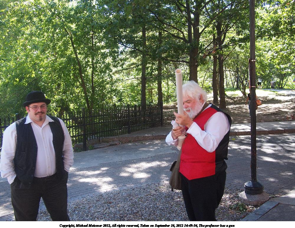 Picture #38: The professor has a gun #2 Small: 1000x773, 281,201 bytes (275K), (html file) Large: 4000x3000, 5,293,534 bytes (5.0M), (html file) Copyright, Michael Meissner 2012, All rights reserved Olympus E-P2 camera with Panasonic 20mm lens f/2.8, ISO 200, 1/200 sec, 20.0mm, auto mode, vivid color, matrix metering, IS1 (All Direction Shake IS), noise filter low 35mm equivalent focal length 40.0mm Programs used: crop, raw therapee Taken by Michael Meissner on September 16, 2012 14:49:54 Last modified on January 13, 2013 at 23:29 |