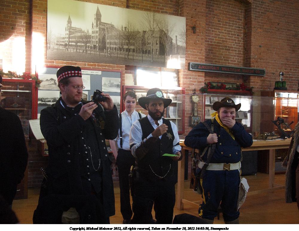 Picture #15: Steampunks Small: 1000x773, 137,905 bytes (135K), (html file) Large: 4000x3000, 3,803,564 bytes (3.6M), (html file) Copyright, Michael Meissner 2012, All rights reserved Olympus E-P2 camera with Panasonic 20mm lens f/2.0, ISO 200, 1/100 sec, 20.0mm, auto mode, vivid color, matrix metering, IS1 (All Direction Shake IS), noise filter low 35mm equivalent focal length 40.0mm Programs used: crop, raw therapee Taken by Michael Meissner on November 18, 2012 14:05:56 Last modified on January 14, 2013 at 00:05 |