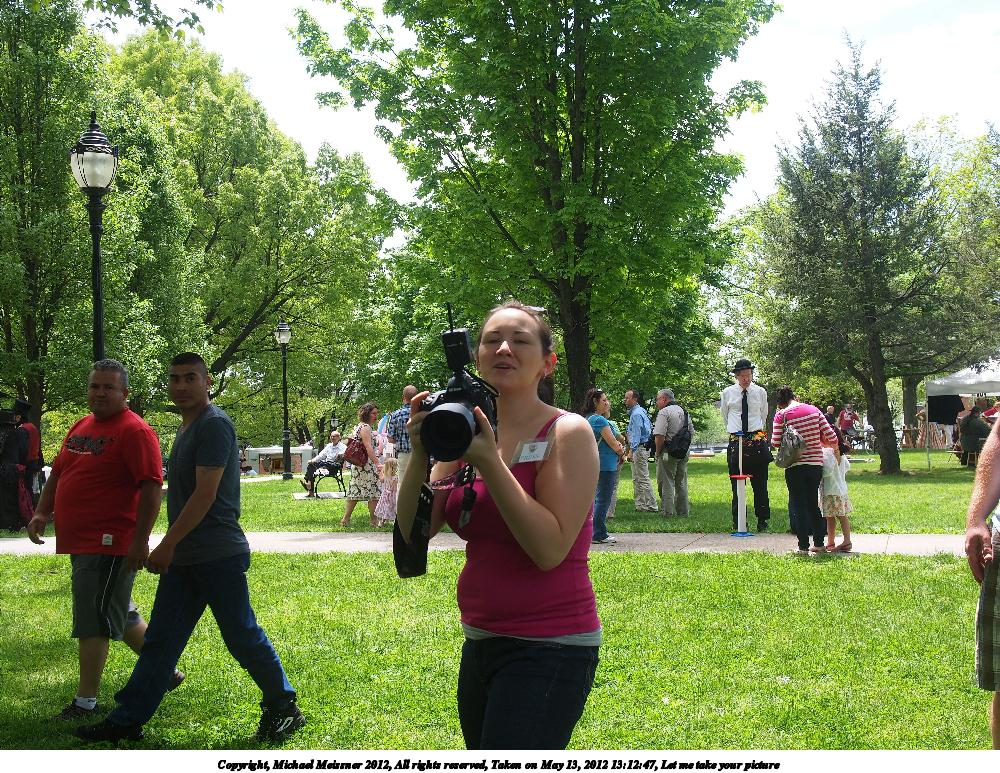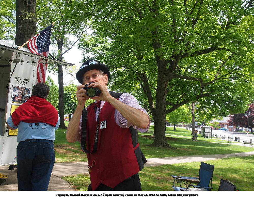 Picture #63: Let me take your picture Small: 1000x773, 227,313 bytes (222K), (html file) Large: 4000x3000, 4,299,916 bytes (4.1M), (html file) Copyright, Michael Meissner 2012, All rights reserved Olympus E-5 camera with Olympus 14-54mm f/2.8-3.5 lens f/5.0, ISO 200, 1/200 sec, 20.0mm, auto mode, vivid color, matrix metering, IS1 (All Direction Shake IS) 35mm equivalent focal length 40.0mm Programs used: crop, raw therapee Taken by Michael Meissner on May 13, 2012 12:17:04 Last modified on June 12, 2012 at 21:24 |