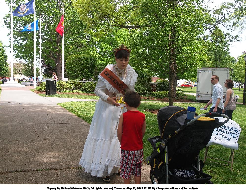 Picture #51: The queen with one of her subjects Small: 1000x773, 273,519 bytes (268K), (html file) Large: 4000x3000, 5,079,336 bytes (4.8M), (html file) Copyright, Michael Meissner 2012, All rights reserved Olympus E-5 camera with Olympus 14-54mm f/2.8-3.5 lens f/5.6, ISO 200, 1/250 sec, 22.0mm, auto mode, vivid color, matrix metering, IS1 (All Direction Shake IS) 35mm equivalent focal length 44.0mm Programs used: crop, raw therapee Taken by Michael Meissner on May 13, 2012 13:10:15 Last modified on June 12, 2012 at 21:39 |