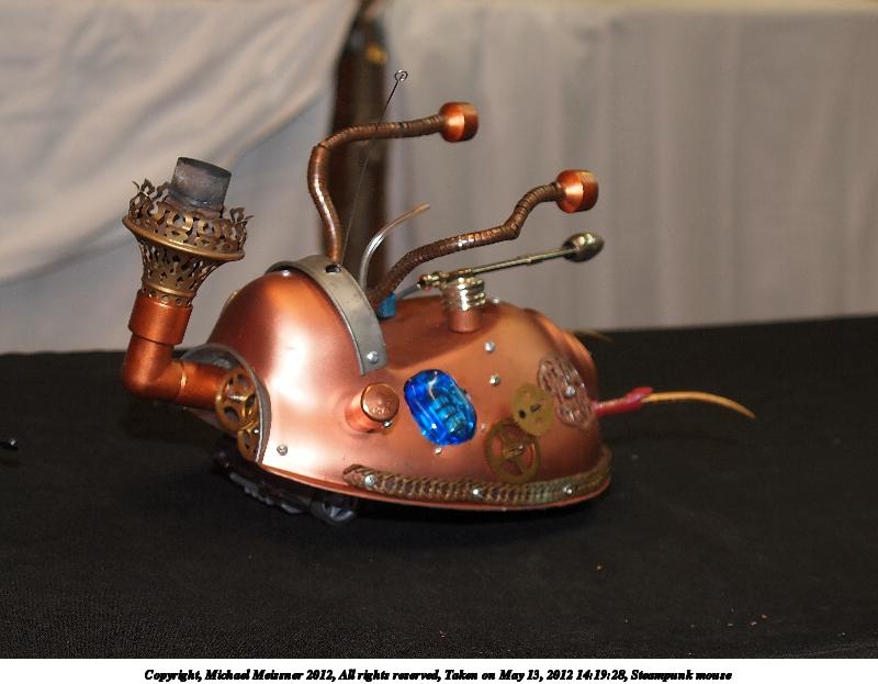 Picture #37: Steampunk mouse Small: 800x623, 64,535 bytes (64K), (html file) Large: 2400x1800, 2,342,611 bytes (2.2M), (html file) Copyright, Michael Meissner 2012, All rights reserved Olympus E-5 camera with Olympus 14-54mm f/2.8-3.5 lens f/3.2, ISO 200, Metz 48 flash (+0.3 flash compensation), 1/60 sec, 29.0mm, auto mode, vivid color, matrix metering, IS1 (All Direction Shake IS) 35mm equivalent focal length 58.0mm Programs used: crop, gimp, raw therapee Taken by Michael Meissner on May 13, 2012 14:19:28 Last modified on June 12, 2012 at 21:53 |