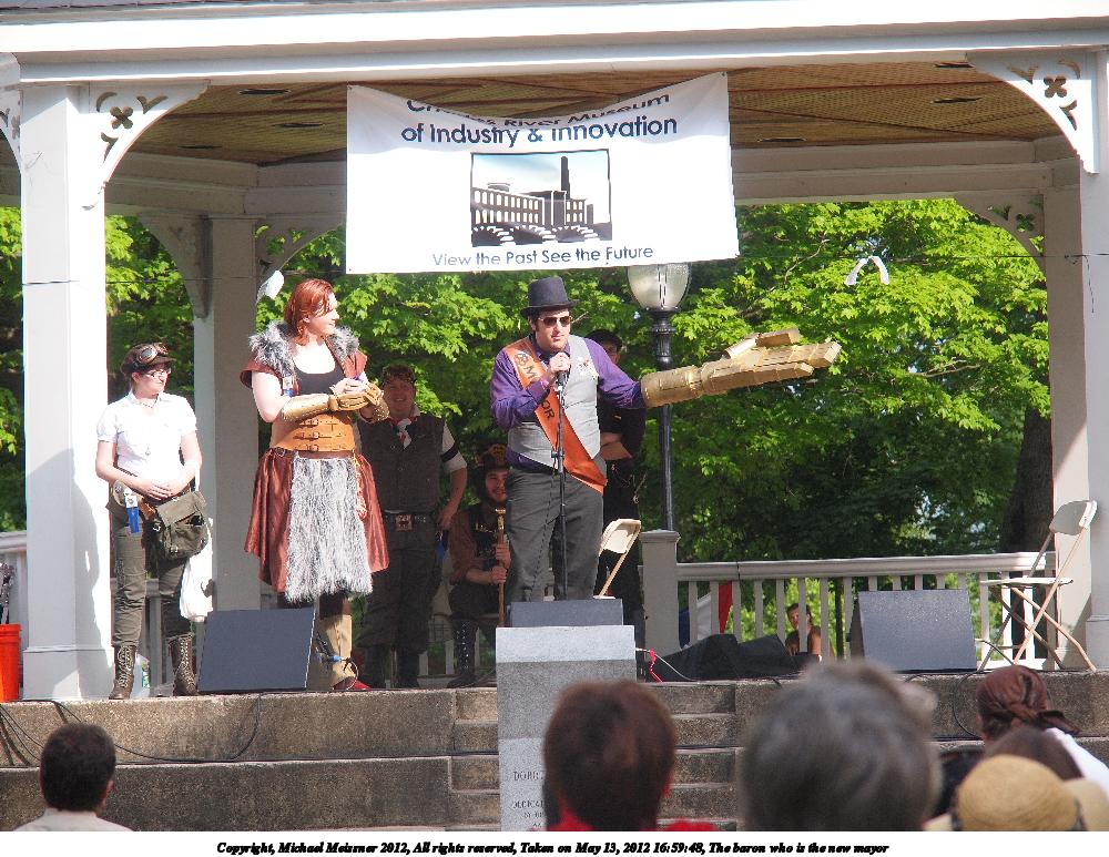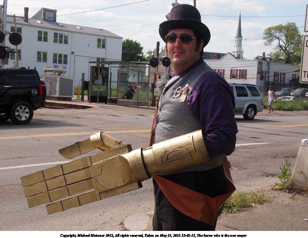 Picture #32: The baron who is the new mayor Small: 1000x773, 151,522 bytes (148K), (html file) Large: 4000x3000, 3,383,688 bytes (3.2M), (html file) Copyright, Michael Meissner 2012, All rights reserved Olympus E-5 camera with Olympus 14-54mm f/2.8-3.5 lens f/8.0, ISO 200, 1/400 sec, 28.0mm, auto mode, vivid color, matrix metering, IS1 (All Direction Shake IS) 35mm equivalent focal length 56.0mm Programs used: crop, raw therapee Taken by Michael Meissner on May 13, 2012 15:43:11 Last modified on June 12, 2012 at 21:56 |