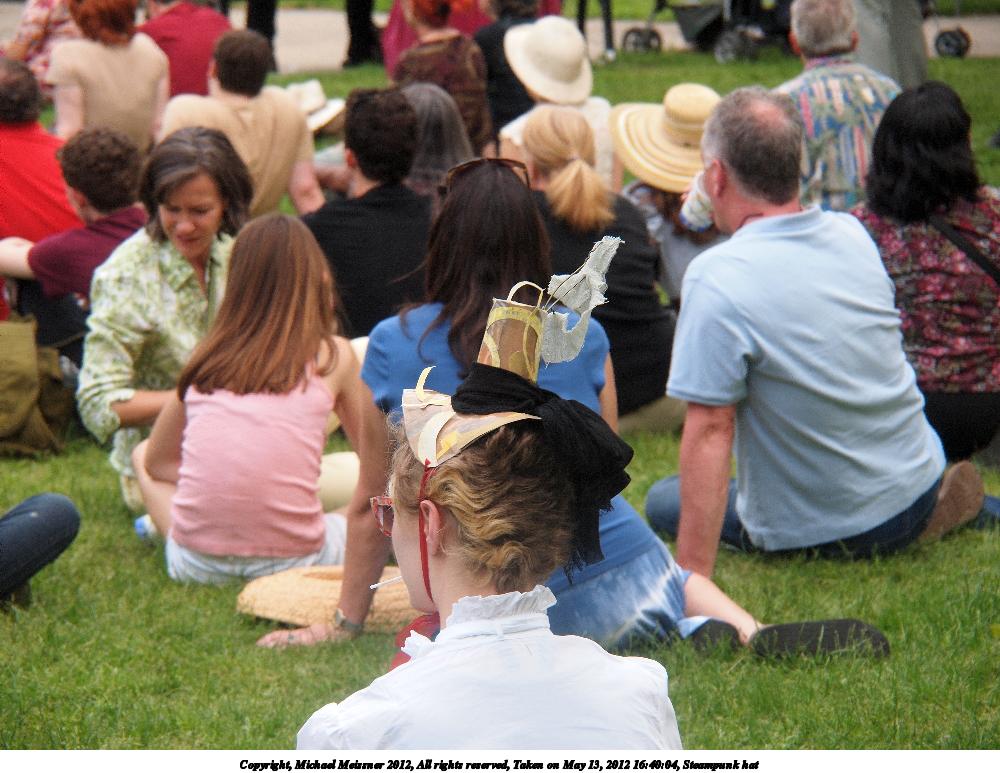 Picture #35: Steampunk hat Small: 800x623, 116,599 bytes (114K), (html file) Large: 2400x1800, 3,066,757 bytes (2.9M), (html file) Copyright, Michael Meissner 2012, All rights reserved Olympus E-5 camera with Olympus 14-54mm f/2.8-3.5 lens f/5.0, ISO 200, 1/160 sec, 27.0mm, auto mode, vivid color, matrix metering, IS1 (All Direction Shake IS) 35mm equivalent focal length 54.0mm Programs used: crop, gimp, raw therapee Taken by Michael Meissner on May 13, 2012 15:27:03 Last modified on June 12, 2012 at 21:55 |