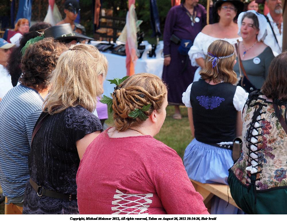 Picture #77: Hair braid Small: 1000x773, 191,296 bytes (187K), (html file) Large: 4000x3000, 4,487,418 bytes (4.3M), (html file) Copyright, Michael Meissner 2012, All rights reserved Olympus E-5 camera with Olympus 14-54mm f/2.8-3.5 lens f/4.5, ISO 200, 1/200 sec, 54.0mm, auto mode, vivid color, matrix metering, IS1 (All Direction Shake IS) 35mm equivalent focal length 108.0mm Programs used: crop, raw therapee Taken by Michael Meissner on August 26, 2012 16:14:26 Last modified on February 17, 2013 at 20:27 |
