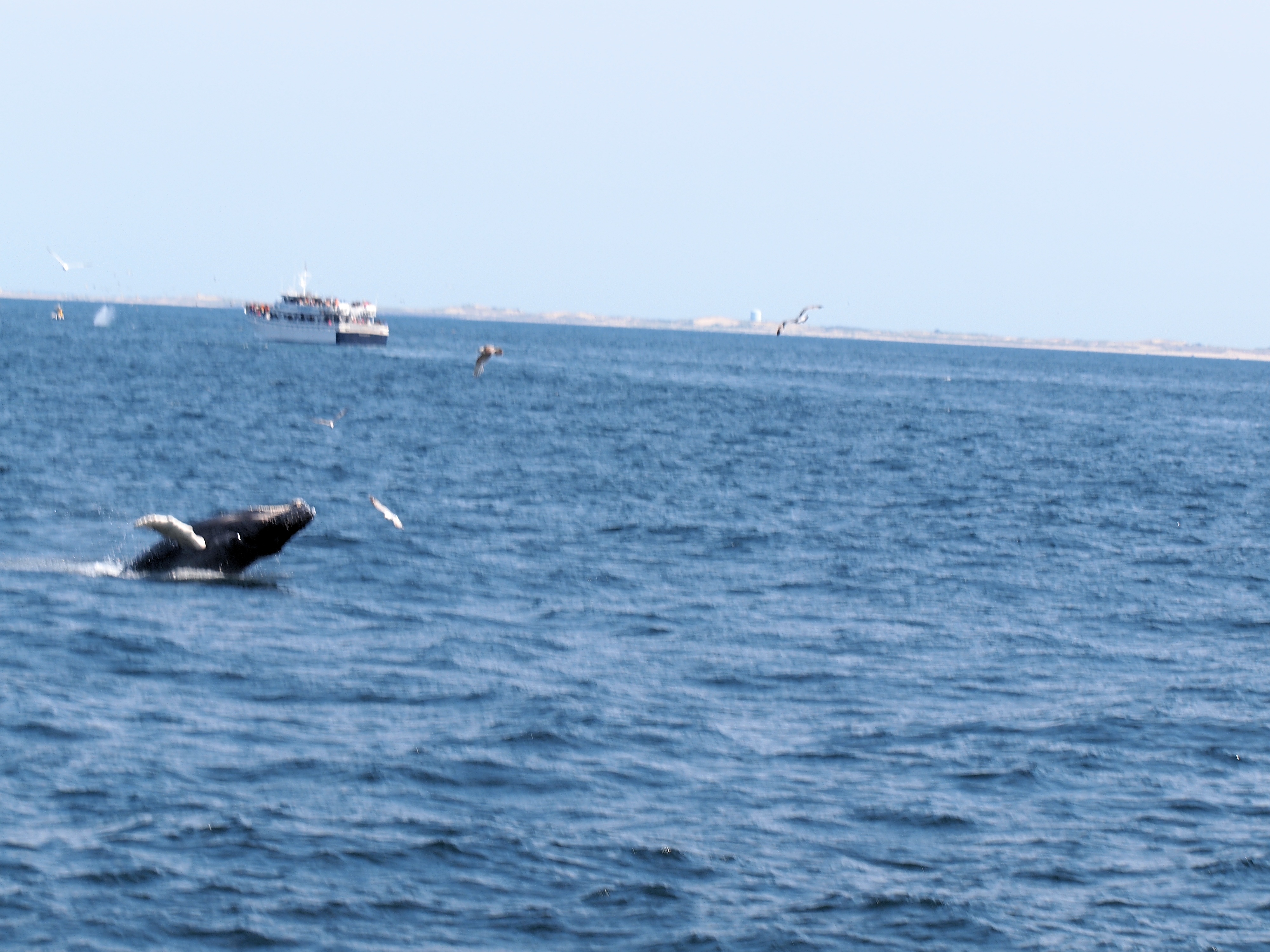 Picture #83: Whale breach Small: 1000x773, 101,679 bytes (100K), (html file) Large: 4000x3000, 2,520,785 bytes (2.4M), (html file) Copyright, Michael Meissner 2012, All rights reserved Olympus E-5 camera with Olympus 50-200mm lens and Olympus EC-14 (1.4x) f/6.3, ISO 200, 1/500 sec, 90.0mm, auto mode, vivid color, matrix metering, IS1 (All Direction Shake IS) 35mm equivalent focal length 180.0mm, EC-14 Programs used: crop, raw therapee Taken by Michael Meissner on May 27, 2012 15:51:43 Last modified on June 02, 2012 at 11:04 Unfortunately this out of focus shot is the only one I got of the whale breach. |