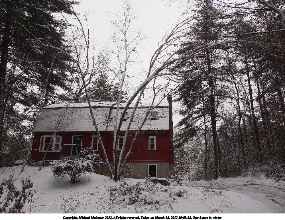 Picture #12: Our house in winter 1000x773, 290,884 bytes (285K), (html file) Copyright, Michael Meissner 2012, All rights reserved Olympus E-5 camera with Olympus 14-54mm f/2.8-3.5 lens f/6.3, ISO 200, 1/400 sec, 14.0mm, auto mode, vivid color, matrix metering, IS1 (All Direction Shake IS), noise reduction auto 35mm equivalent focal length 28.0mm Programs used: crop, raw therapee Taken by Michael Meissner on March 02, 2012 10:53:02 Last modified on March 02, 2012 at 22:00 |