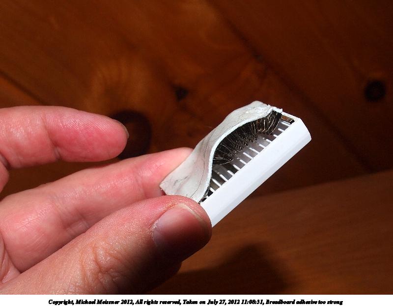 Picture #6: Breadboard adhesive too strong 800x623, 62,338 bytes (61K), (html file) Copyright, Michael Meissner 2012, All rights reserved Olympus E-5 camera with Olympus 14-54mm f/2.8-3.5 lens f/8.0, ISO 200, flash (+0.3 flash compensation), 1/60 sec, 14.0mm, aperture priority, vivid color, matrix metering, IS1 (All Direction Shake IS) 35mm equivalent focal length 28.0mm Programs used: crop, raw therapee Taken by Michael Meissner on July 27, 2012 11:08:31 Last modified on July 27, 2012 at 11:29 I used the adhesive backing on the tiny breadboard, and then wanted to move it. The adhesive was too strong, and it ripped off the bottom of the breadboard. |