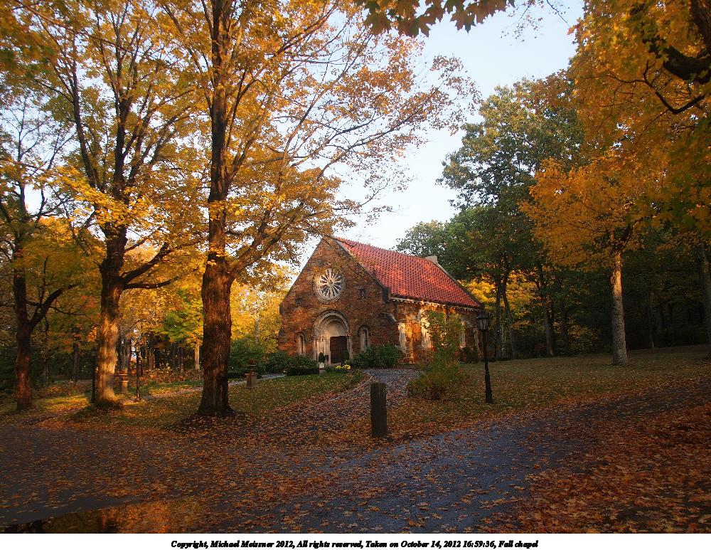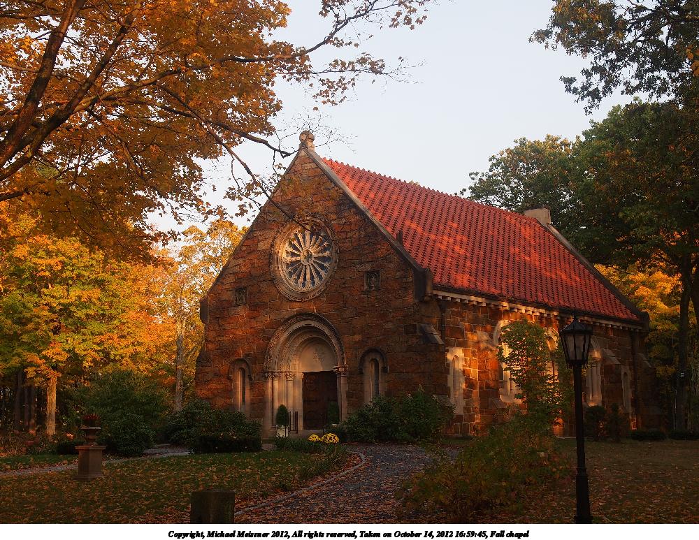 Picture #3: Fall chapel #2 Thumb: 500x375, 62,138 bytes (61K) Small: 1000x773, 246,633 bytes (241K), (html file) Copyright, Michael Meissner 2012, All rights reserved Olympus E-5 camera with Olympus 14-54mm f/2.8-3.5 lens f/5.6, ISO 200, 1/200 sec, 29.0mm, auto mode, vivid color, matrix metering, IS1 (All Direction Shake IS) 35mm equivalent focal length 58.0mm Programs used: crop, raw therapee Taken by Michael Meissner on October 14, 2012 16:59:45 Last modified on June 11, 2013 at 22:17 This picture is one of my favorites. |