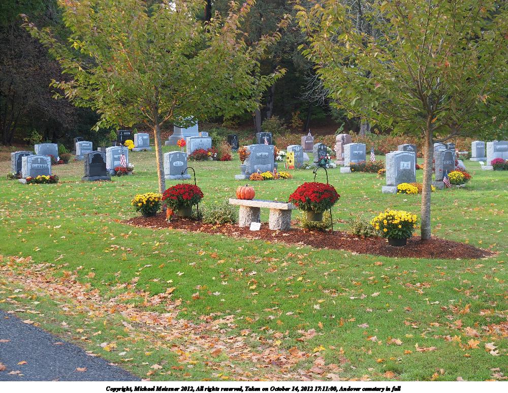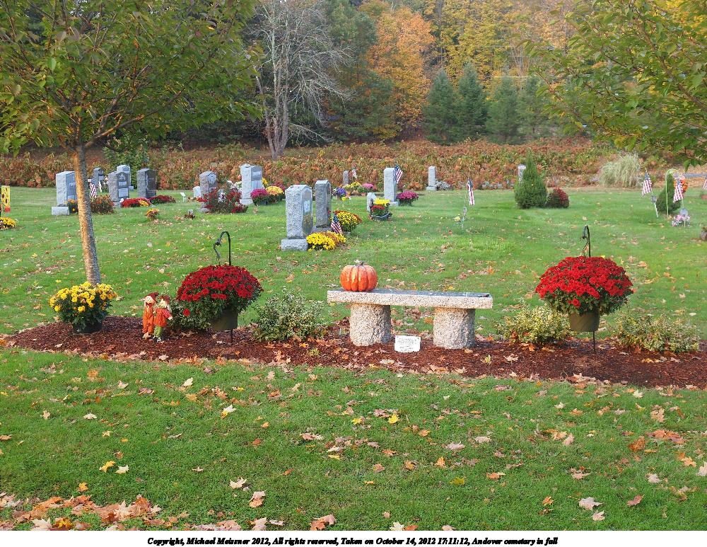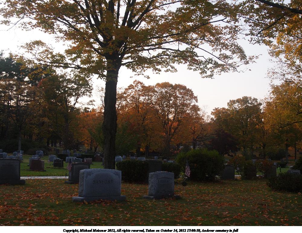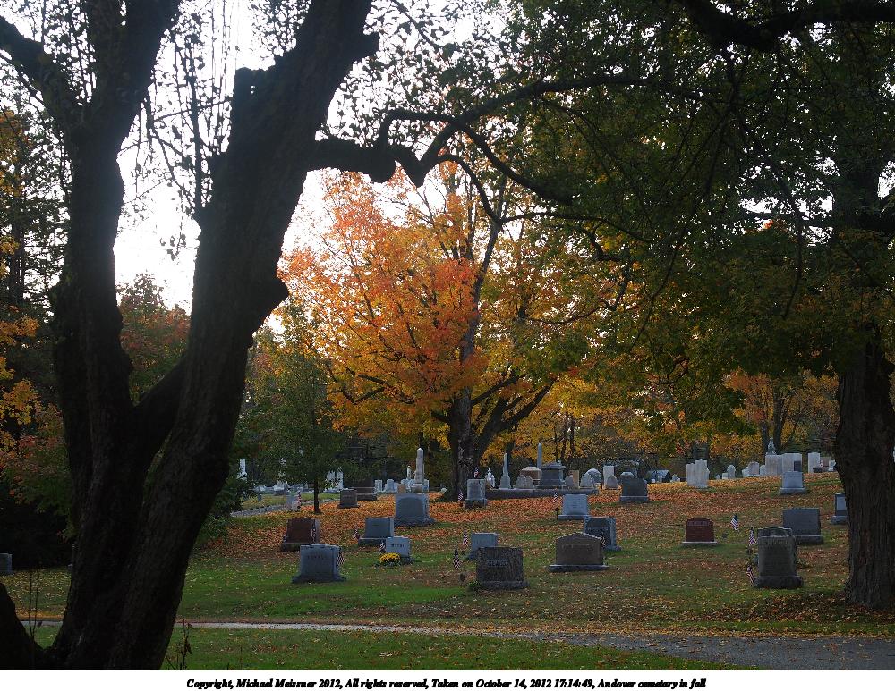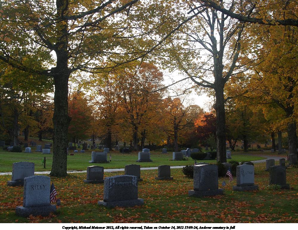 Picture #1: Andover cemetary in fall Thumb: 500x375, 69,831 bytes (69K) Small: 1000x773, 252,255 bytes (247K), (html file) Copyright, Michael Meissner 2012, All rights reserved Olympus E-5 camera with Olympus 14-54mm f/2.8-3.5 lens f/4.5, ISO 200, 1/160 sec, 14.0mm, auto mode, vivid color, matrix metering, IS1 (All Direction Shake IS) 35mm equivalent focal length 28.0mm Programs used: crop, raw therapee Taken by Michael Meissner on October 14, 2012 16:58:58 Last modified on June 11, 2013 at 22:16 |