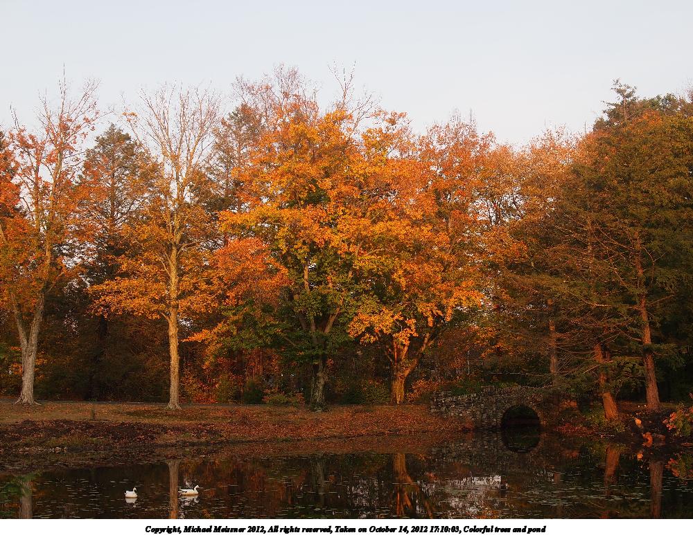 Picture #10: Colorful trees and pond #2 Thumb: 500x375, 54,930 bytes (54K) Small: 1000x773, 232,740 bytes (228K), (html file) Copyright, Michael Meissner 2012, All rights reserved Olympus E-5 camera with Olympus 14-54mm f/2.8-3.5 lens f/5.6, ISO 200, 1/200 sec, 28.0mm, auto mode, vivid color, matrix metering, IS1 (All Direction Shake IS) 35mm equivalent focal length 56.0mm Programs used: crop, raw therapee Taken by Michael Meissner on October 14, 2012 17:10:03 Last modified on June 11, 2013 at 22:20 |