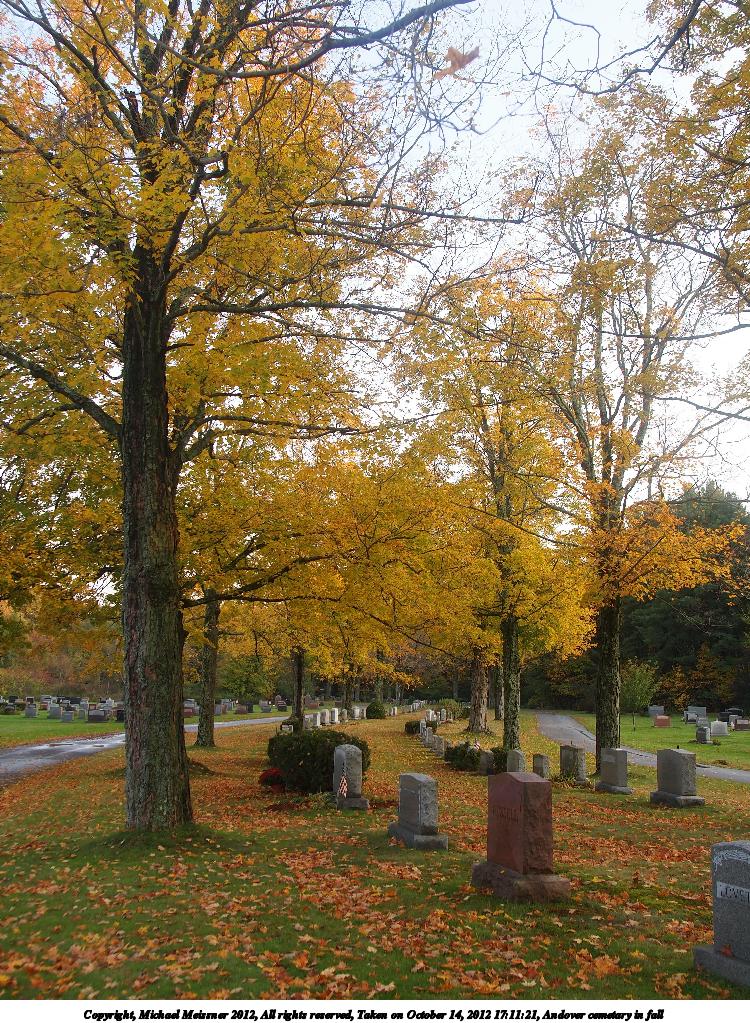 Picture #6: Andover cemetary in fall #2 Thumb: 500x375, 64,151 bytes (63K) Small: 1000x773, 235,243 bytes (230K), (html file) Copyright, Michael Meissner 2012, All rights reserved Olympus E-5 camera with Olympus 14-54mm f/2.8-3.5 lens f/5.6, ISO 200, 1/250 sec, 23.0mm, auto mode, vivid color, matrix metering, IS1 (All Direction Shake IS) 35mm equivalent focal length 46.0mm Programs used: crop, raw therapee Taken by Michael Meissner on October 14, 2012 17:08:58 Last modified on June 11, 2013 at 22:18 |