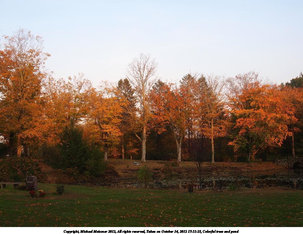 Picture #9: Colorful trees and pond Thumb: 500x375, 59,560 bytes (59K) Small: 1000x773, 251,041 bytes (246K), (html file) Copyright, Michael Meissner 2012, All rights reserved Olympus E-5 camera with Olympus 14-54mm f/2.8-3.5 lens f/5.0, ISO 200, 1/160 sec, 31.0mm, auto mode, vivid color, matrix metering, IS1 (All Direction Shake IS) 35mm equivalent focal length 62.0mm Programs used: crop, raw therapee Taken by Michael Meissner on October 14, 2012 17:09:48 Last modified on June 11, 2013 at 22:20 This picture is one of my favorites. |