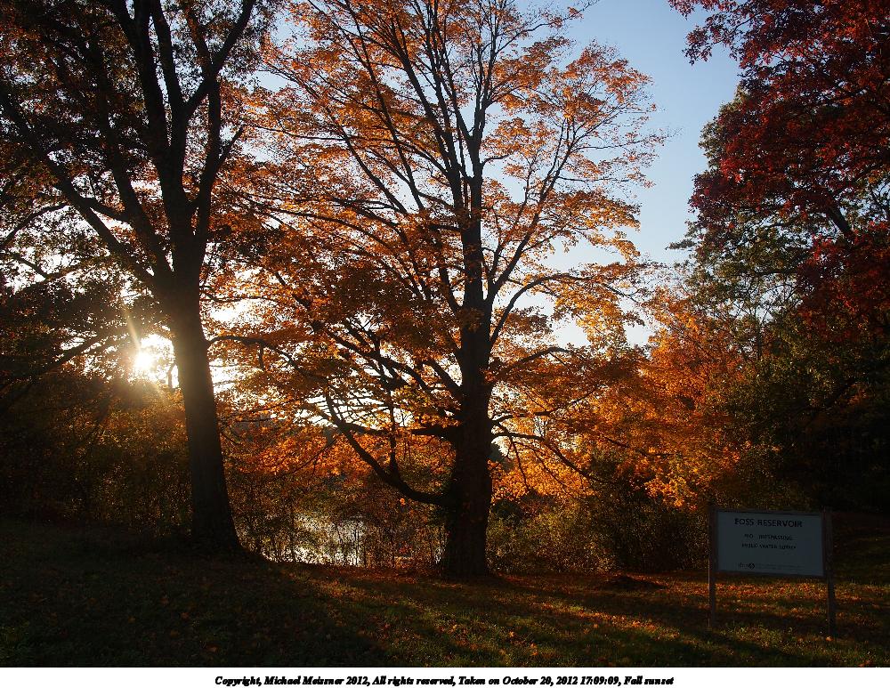Picture #30: Fall sunset Thumb: 500x375, 71,334 bytes (70K) Small: 1000x773, 290,708 bytes (284K), (html file) Copyright, Michael Meissner 2012, All rights reserved Olympus E-5 camera with Olympus 14-54mm f/2.8-3.5 lens f/6.3, ISO 200, 1/320 sec, 17.0mm, auto mode, vivid color, matrix metering, IS1 (All Direction Shake IS) 35mm equivalent focal length 34.0mm Programs used: crop, raw therapee Taken by Michael Meissner on October 20, 2012 17:09:09 Last modified on June 11, 2013 at 22:26 This picture is one of my favorites. |