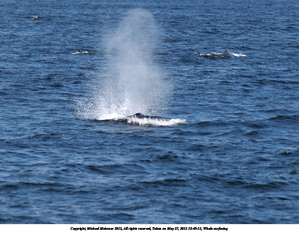 Picture #47: Whale surfacing #3 1000x773, 151,790 bytes (149K), (html file) Olympus E-5 camera with Olympus 50-200mm lens and Olympus EC-14 (1.4x) f/7.1, ISO 200, 1/640 sec, 80.0mm, auto mode, vivid color, matrix metering, IS1 (All Direction Shake IS) 35mm equivalent focal length 160.0mm, EC-14 Programs used: crop, raw therapee Taken by Michael Meissner on May 27, 2012 16:05:59 Last modified on June 02, 2012 at 22:37 |