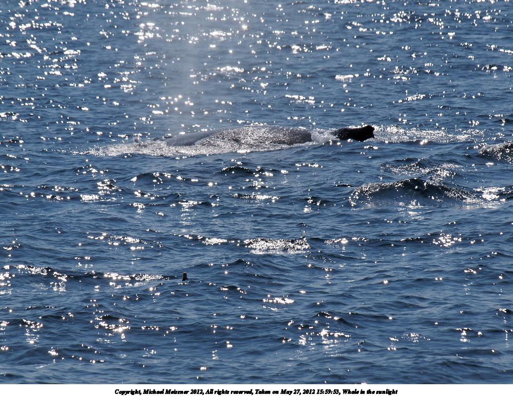 Picture #38: Whale in the sunlight #5 1000x773, 191,212 bytes (187K), (html file) Copyright, Michael Meissner 2012, All rights reserved Olympus E-5 camera with Olympus 50-200mm lens and Olympus EC-14 (1.4x) f/9.0, ISO 200, 1/1000 sec, 283.0mm, auto mode, vivid color, matrix metering, IS1 (All Direction Shake IS) 35mm equivalent focal length 567.0mm, EC-14 Programs used: crop, raw therapee Taken by Michael Meissner on May 27, 2012 16:24:50 Last modified on June 02, 2012 at 21:04 |