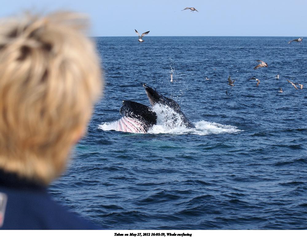Picture #63: Whale and birds #23 1000x773, 221,180 bytes (216K), (html file) Copyright, Michael Meissner 2012, All rights reserved Olympus E-5 camera with Olympus 50-200mm lens and Olympus EC-14 (1.4x) f/9.0, ISO 200, 1/1000 sec, 258.0mm, auto mode, vivid color, matrix metering, IS1 (All Direction Shake IS) 35mm equivalent focal length 517.0mm, EC-14 Programs used: crop, raw therapee Taken by Michael Meissner on May 27, 2012 15:54:41 Last modified on June 02, 2012 at 11:24 |