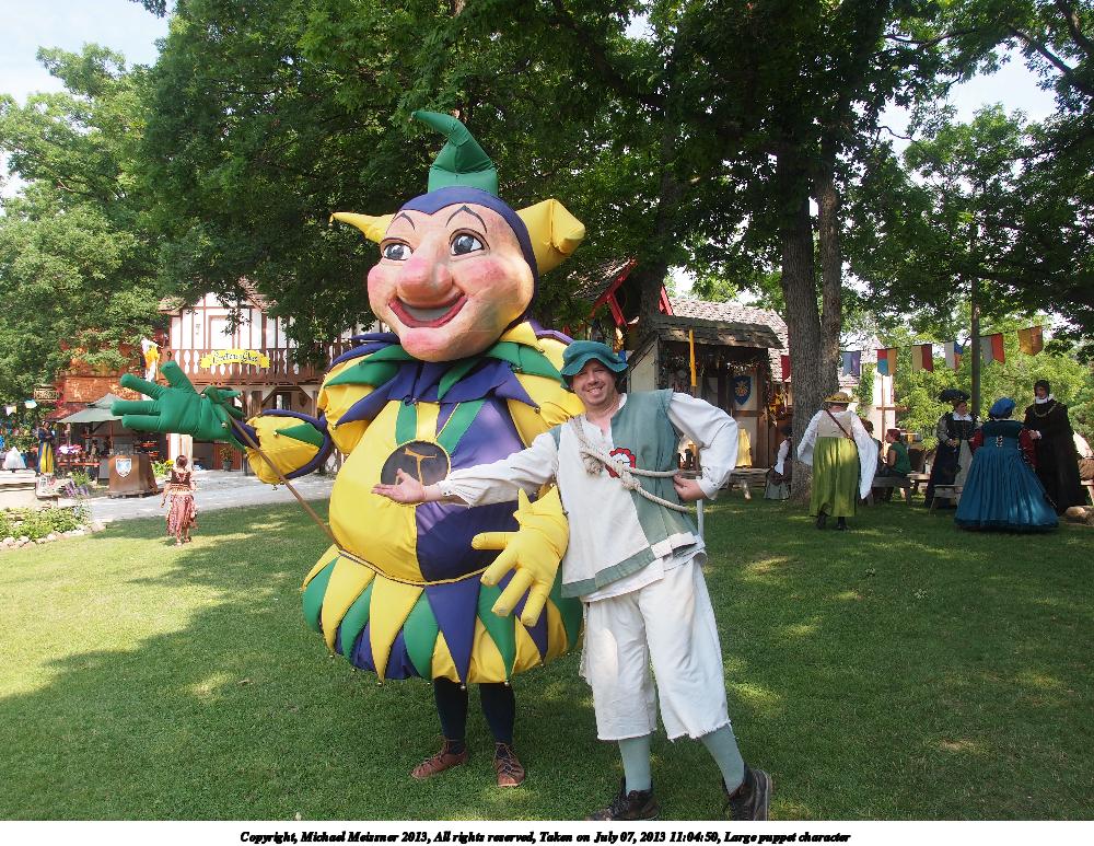 Picture #31: Large puppet character Thumb: 500x375, 69,707 bytes (69K) Small: 1000x773, 246,800 bytes (242K), (html file) Large: 4000x3000, 6,162,271 bytes (5.9M), (html file) Copyright, Michael Meissner 2013, All rights reserved Olympus E-5 camera with Olympus 14-54mm f/2.8-3.5 lens f/5.6, ISO 200, 1/250 sec, 14.0mm, auto mode, vivid color, matrix metering, IS1 (All Direction Shake IS) 35mm equivalent focal length 28.0mm Programs used: crop Taken by Michael Meissner on July 07, 2013 11:04:50 Last modified on December 05, 2013 at 00:24 |