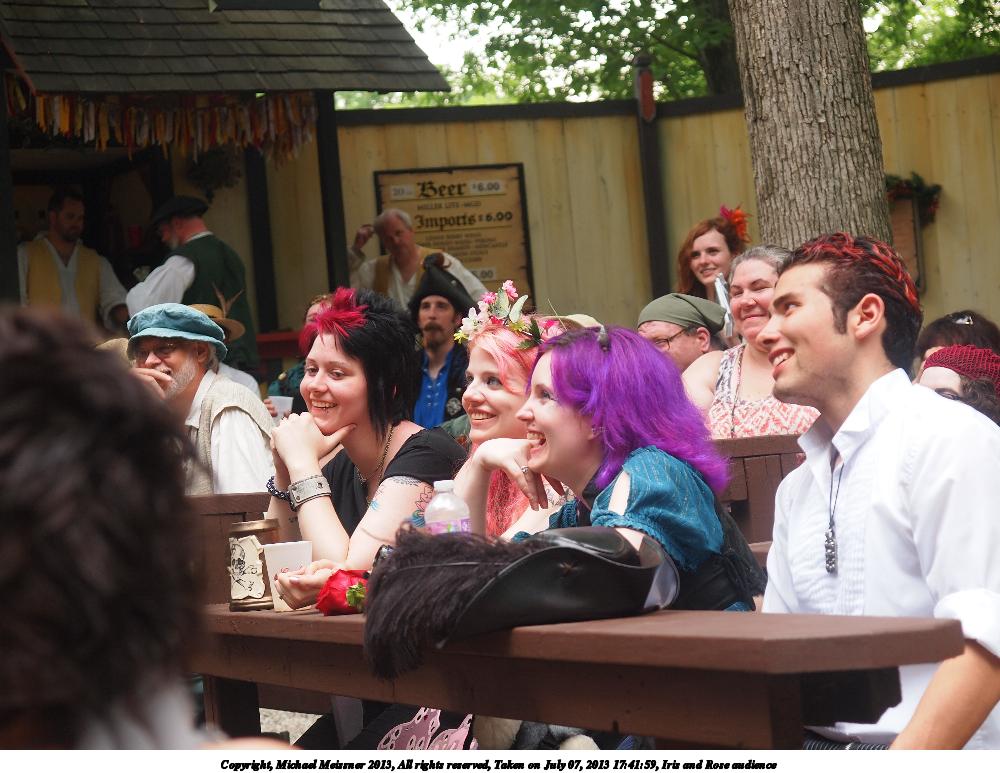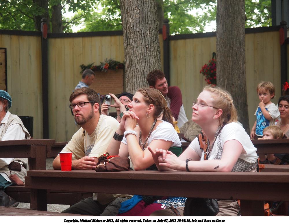 Picture #5: Iris and Rose audience #2 Thumb: 500x375, 54,909 bytes (54K) Small: 1000x773, 140,719 bytes (138K), (html file) Large: 4000x3000, 5,460,056 bytes (5.2M), (html file) Copyright, Michael Meissner 2013, All rights reserved Olympus E-5 camera with Olympus 14-54mm f/2.8-3.5 lens f/3.4, ISO 250, 1/100 sec, 49.0mm, auto mode, vivid color, matrix metering, IS1 (All Direction Shake IS) 35mm equivalent focal length 98.0mm Programs used: crop Taken by Michael Meissner on July 07, 2013 18:05:18 Last modified on December 05, 2013 at 00:45 |