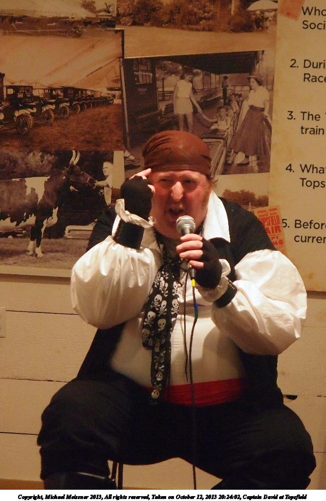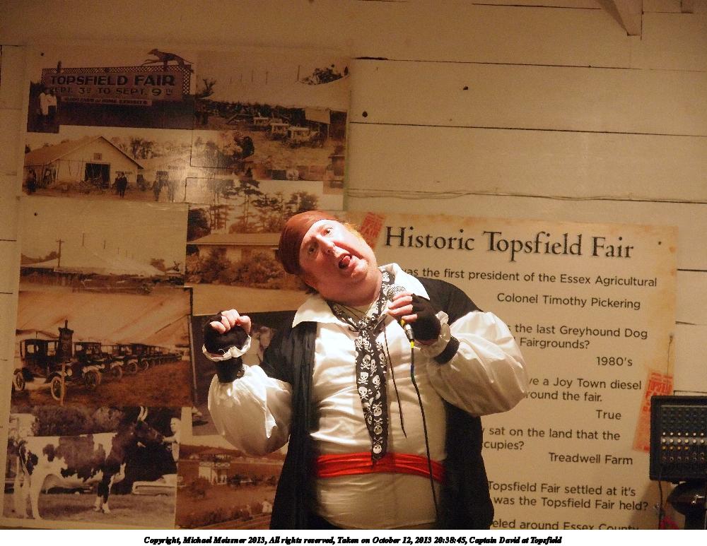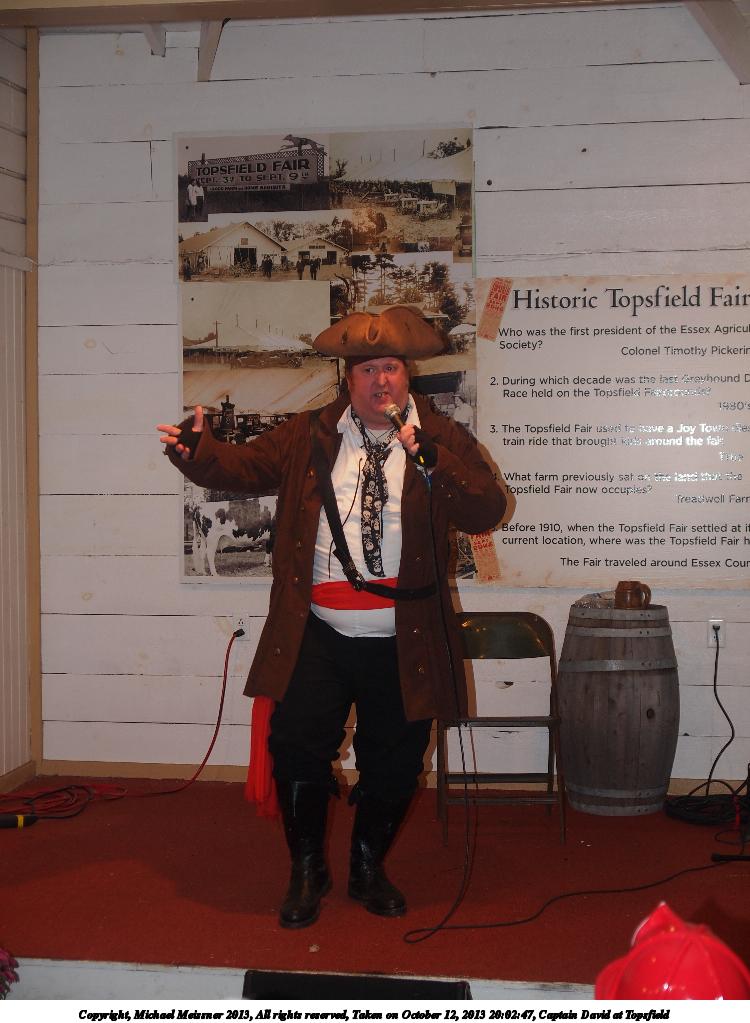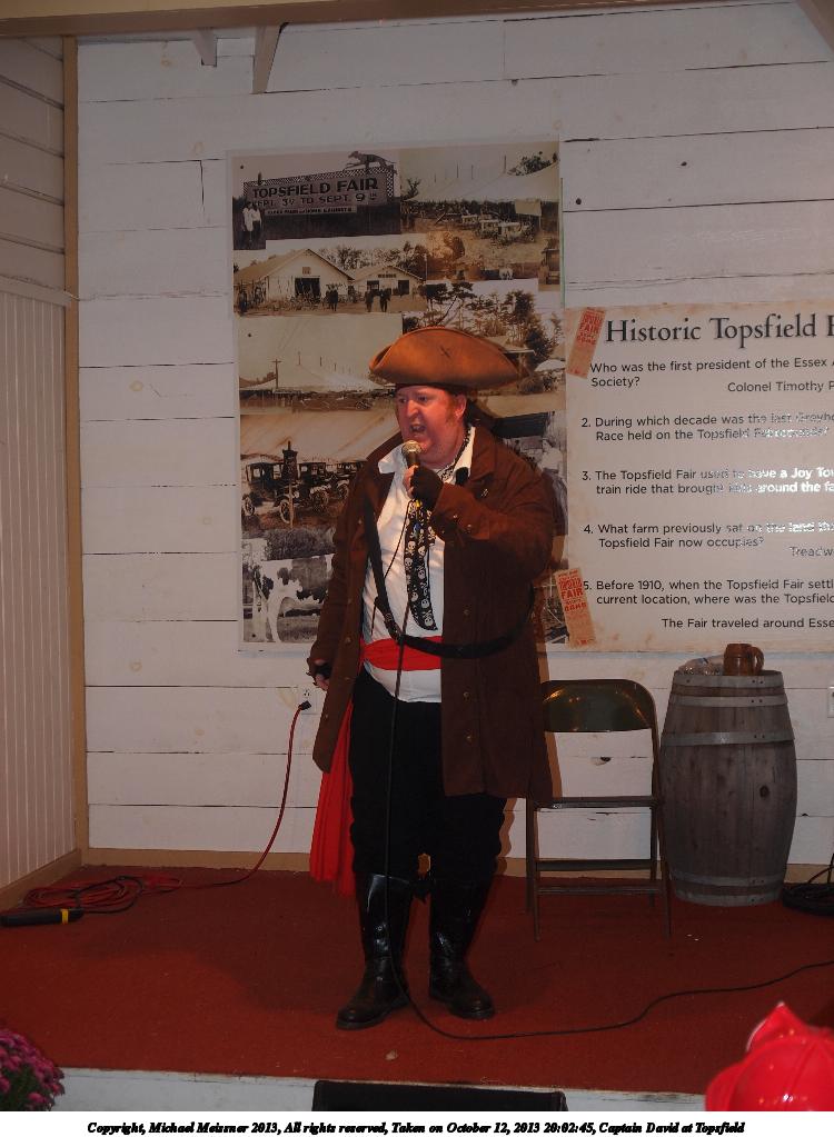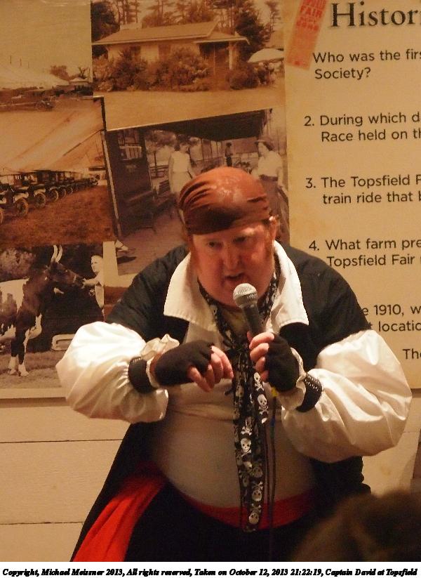 Picture #2: Captain David at Topsfield #2 Small: 750x1023, 119,203 bytes (117K), (html file) Large: 3000x4000, 5,864,308 bytes (5.6M), (html file) Copyright, Michael Meissner 2013, All rights reserved Olympus E-5 camera with Olympus 14-54mm f/2.8-3.5 lens f/3.4, ISO 320, flash (+0.3 flash compensation), 1/60 sec, 44.0mm, auto mode, vivid color, matrix metering, IS1 (All Direction Shake IS) 35mm equivalent focal length 88.0mm Programs used: crop, rotate left Taken by Michael Meissner on October 12, 2013 21:00:58 Last modified on February 16, 2014 at 20:01 |