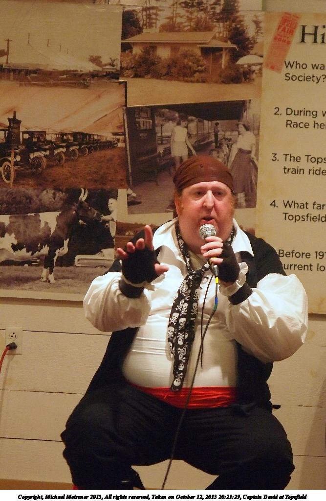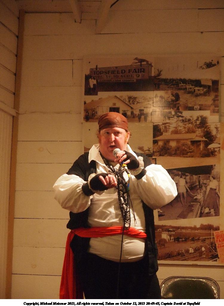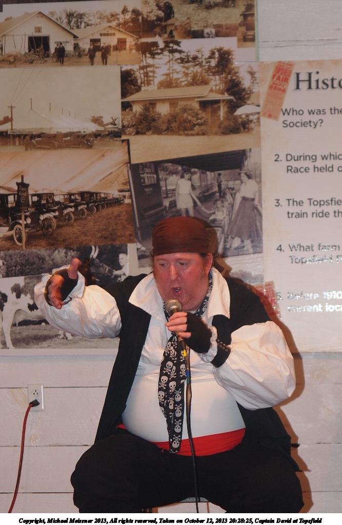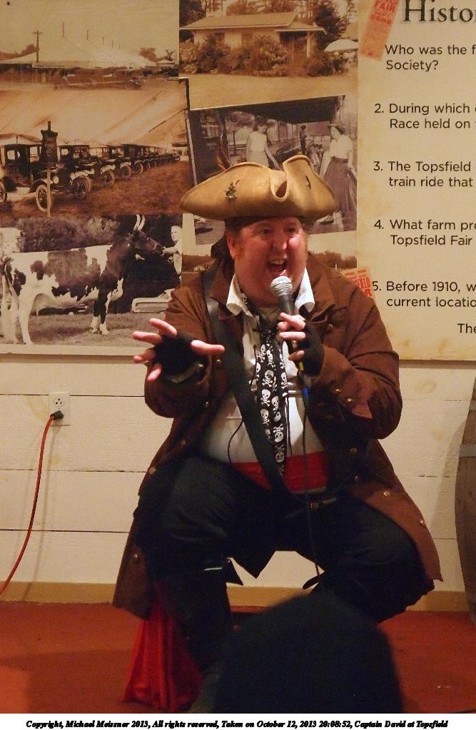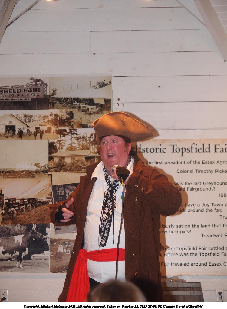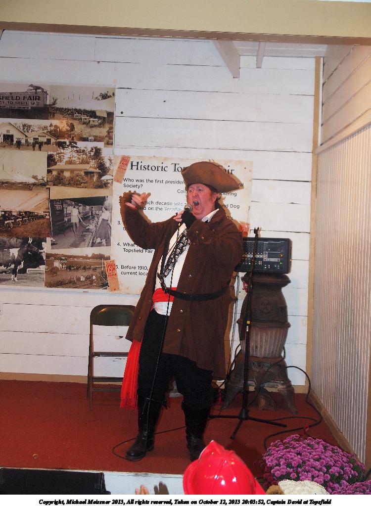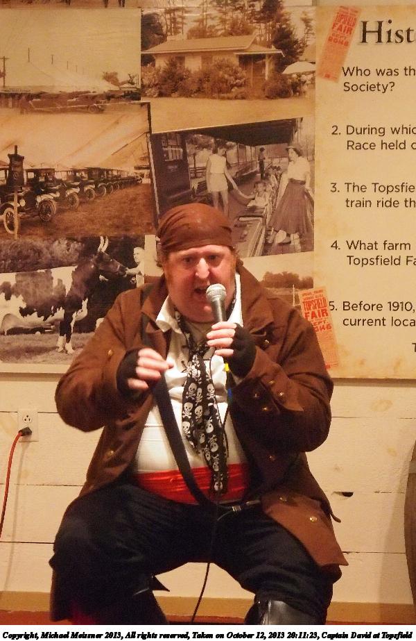 Picture #8: Captain David at Topsfield #8 Small: 750x1023, 110,480 bytes (108K), (html file) Large: 3000x4000, 5,432,141 bytes (5.2M), (html file) Copyright, Michael Meissner 2013, All rights reserved Olympus E-5 camera with Olympus 14-54mm f/2.8-3.5 lens f/3.2, ISO 200, flash (+0.3 flash compensation), 1/60 sec, 31.0mm, auto mode, vivid color, matrix metering, IS1 (All Direction Shake IS) 35mm equivalent focal length 62.0mm Programs used: crop, rotate left Taken by Michael Meissner on October 12, 2013 20:02:47 Last modified on February 17, 2014 at 08:27 |