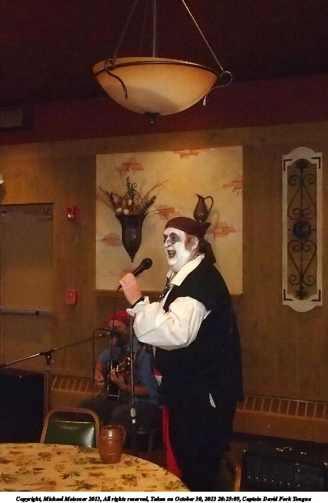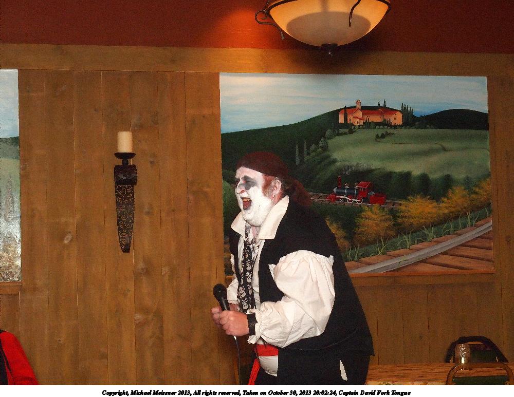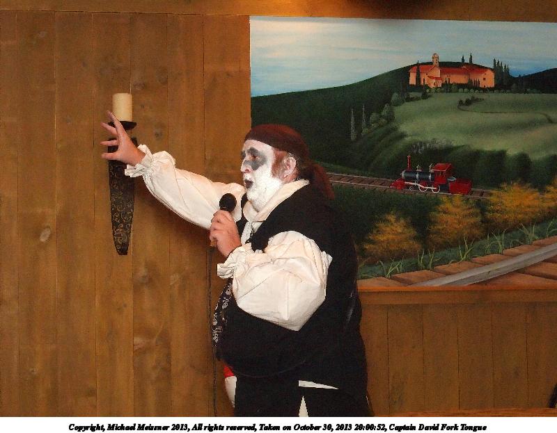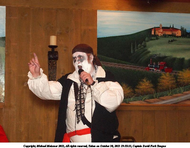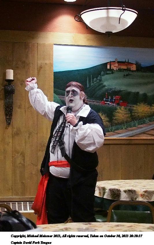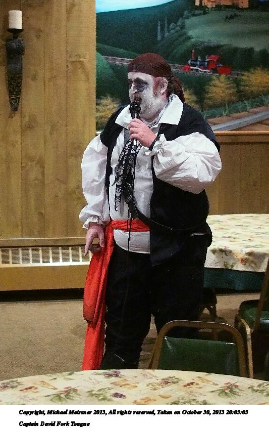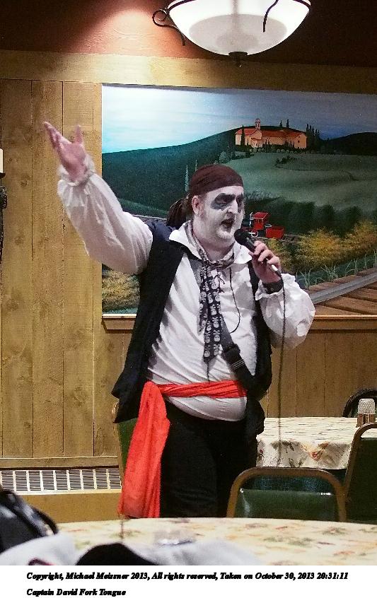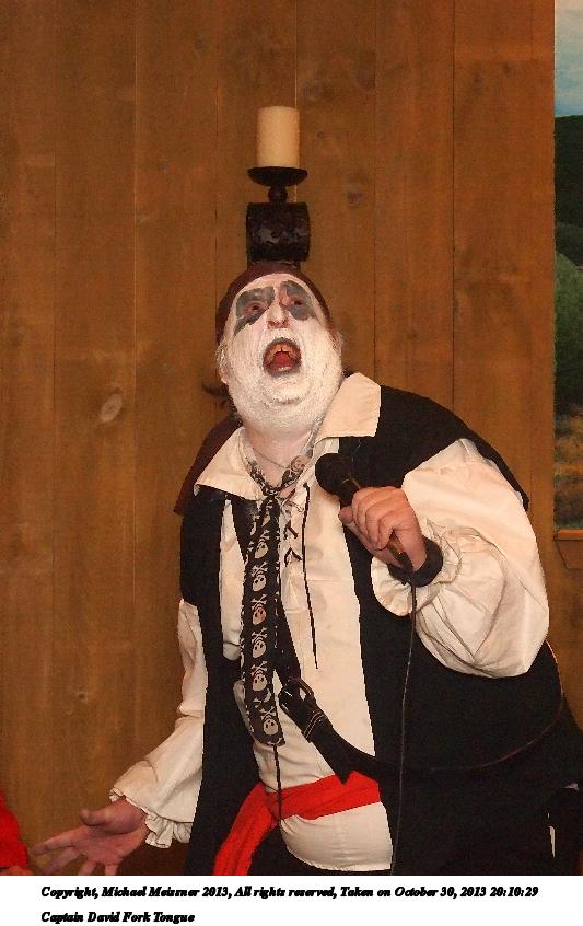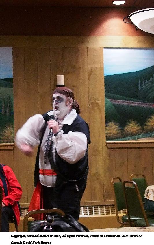 Picture #31: Captain David Fork Tongue #17 Small: 533x846, 82,887 bytes (81K), (html file) Large: 1600x2400, 1,261,835 bytes (1.2M), (html file) Copyright, Michael Meissner 2013, All rights reserved Olympus E-5 camera with Olympus 14-54mm f/2.8-3.5 lens f/5.6, ISO 1250, FL-36 flash (+0.3 flash compensation), 1/60 sec, 38.0mm, aperture priority, vivid color, matrix metering, IS1 (All Direction Shake IS) 35mm equivalent focal length 76.0mm Programs used: crop, raw therapee Taken by Michael Meissner on October 30, 2013 20:10:29 Last modified on February 16, 2014 at 22:44 |