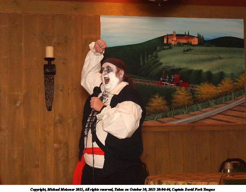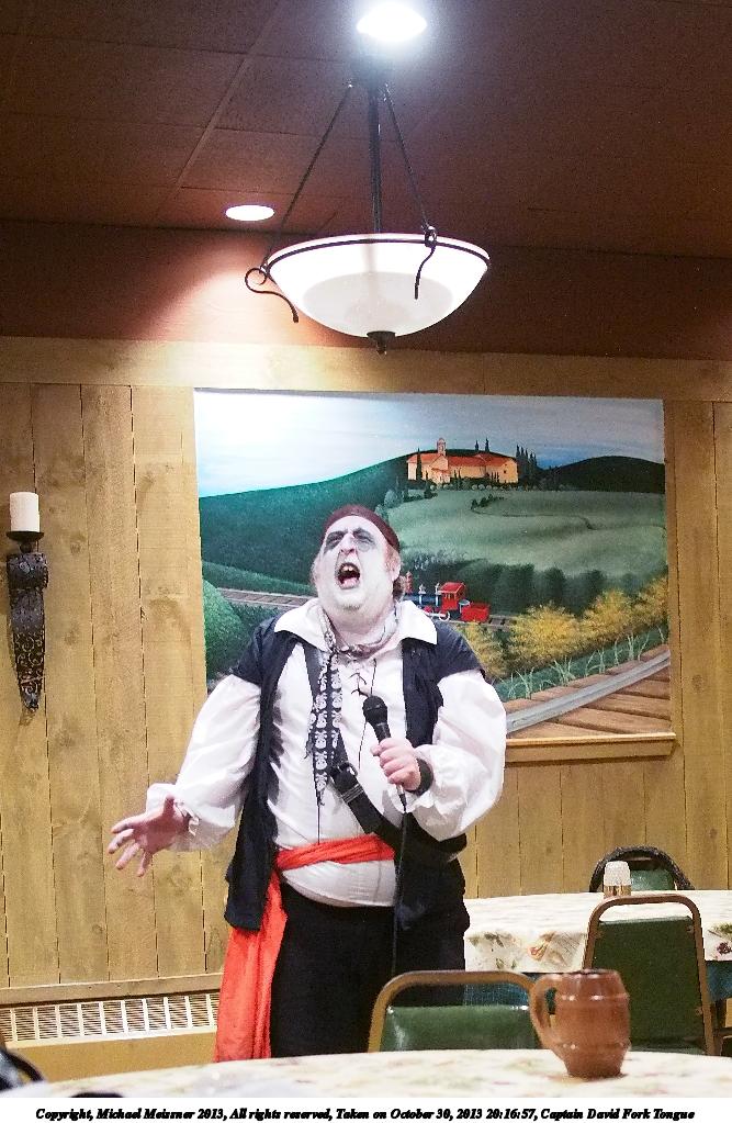 Picture #24: Captain David Fork Tongue #11 Small: 800x623, 87,946 bytes (86K), (html file) Large: 3200x2400, 2,595,340 bytes (2.5M), (html file) Copyright, Michael Meissner 2013, All rights reserved Olympus E-5 camera with Olympus 14-54mm f/2.8-3.5 lens f/5.6, ISO 1600, FL-36 flash (+0.3 flash compensation), 1/60 sec, 38.0mm, aperture priority, vivid color, matrix metering, IS1 (All Direction Shake IS) 35mm equivalent focal length 76.0mm Taken by Michael Meissner on October 30, 2013 20:00:52 Last modified on February 16, 2014 at 22:40 |