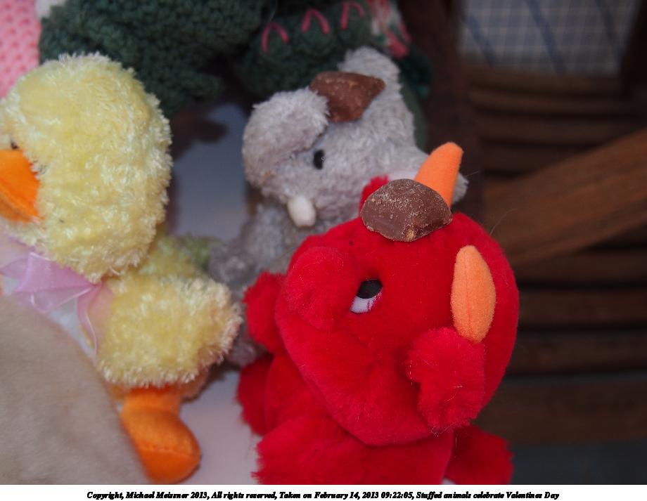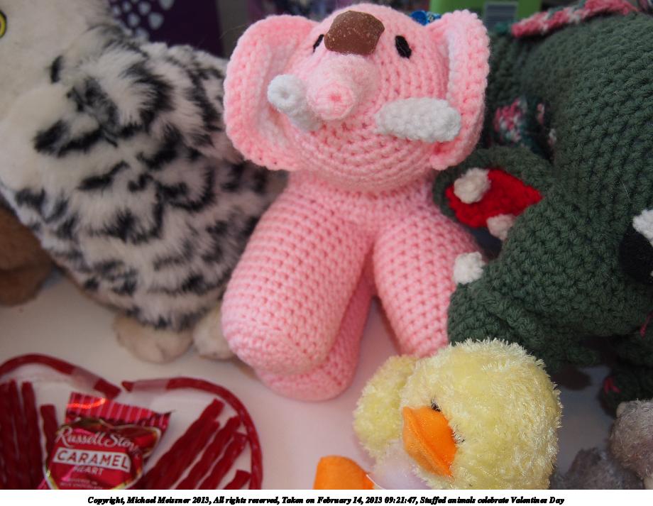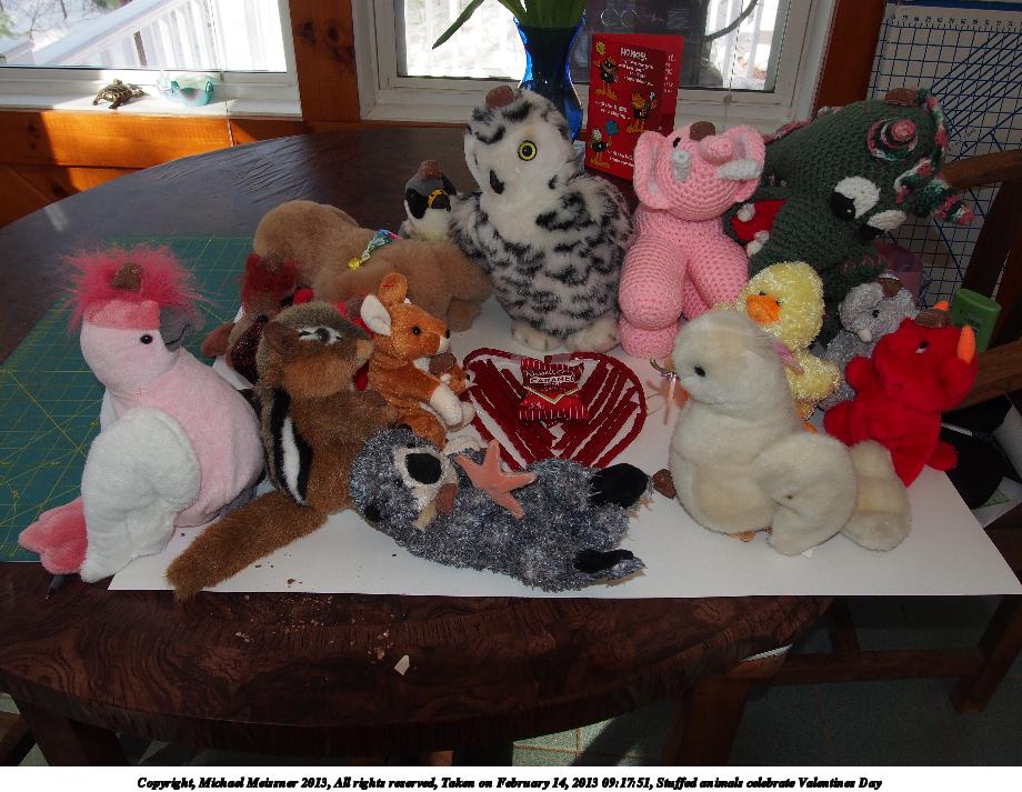 Picture #42: Stuffed animals celebrate Valentines Day 920x713, 136,948 bytes (134K), (html file) Copyright, Michael Meissner 2013, All rights reserved Olympus E-PM2 camera with Olympus-m43 14-42mm-IIR f/3.5-5.6 lens f/8.0, ISO 320, flash (+0.33 flash compensation), 1/60 sec, 17.0mm, aperture priority, vivid color, matrix metering, IS1 (All Direction Shake IS) 35mm equivalent focal length 34.0mm Programs used: crop Taken by Michael Meissner on February 14, 2013 09:17:41 Last modified on February 14, 2013 at 11:04 This picture is one of my favorites. |