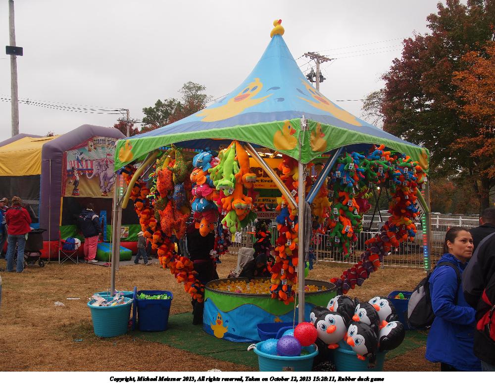 Picture #40: Rubber duck game 1000x773, 183,471 bytes (180K), (html file) Copyright, Michael Meissner 2013, All rights reserved Olympus E-5 camera with Olympus 14-54mm f/2.8-3.5 lens f/4.0, ISO 200, 1/125 sec, 19.0mm, auto mode, vivid color, matrix metering, IS1 (All Direction Shake IS) 35mm equivalent focal length 38.0mm Programs used: crop Taken by Michael Meissner on October 12, 2013 15:28:11 Last modified on February 17, 2014 at 08:05 |