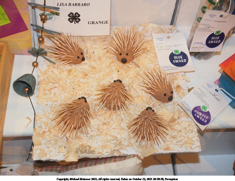 Picture #2: Porcupines 1000x773, 158,448 bytes (155K), (html file) Copyright, Michael Meissner 2013, All rights reserved Olympus E-5 camera with Olympus 14-54mm f/2.8-3.5 lens f/3.1, ISO 200, flash (+0.3 flash compensation), 1/60 sec, 28.0mm, auto mode, vivid color, matrix metering, IS1 (All Direction Shake IS) 35mm equivalent focal length 56.0mm Programs used: crop Taken by Michael Meissner on October 12, 2013 20:58:58 Last modified on February 17, 2014 at 08:46 |