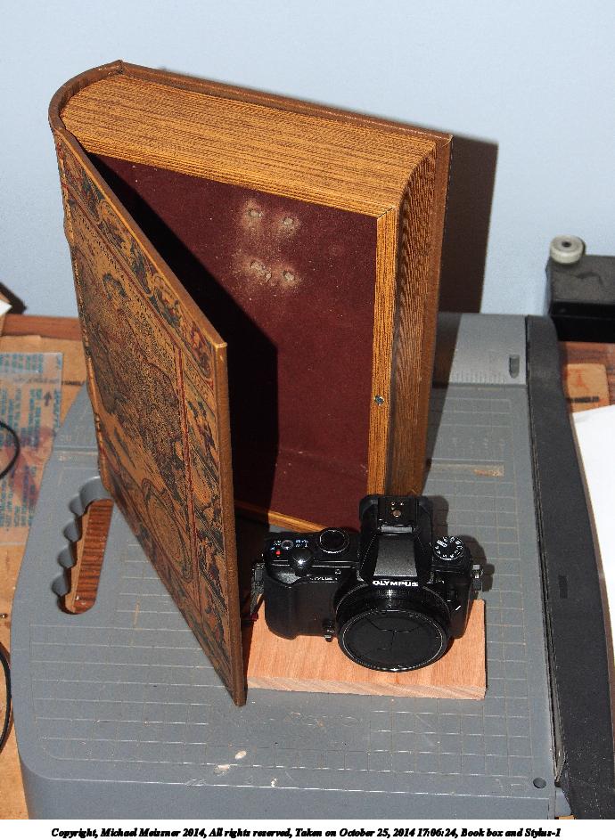 Picture #5: Disguising an Olympus Stylus-1 as a book #2 Thumb: 460x345, 44,752 bytes (44K) Small: 920x713, 167,363 bytes (164K), (html file) Large: 4600x3450, 6,352,434 bytes (6.1M), (html file) Copyright, Michael Meissner 2014, All rights reserved Olympus E-M5-I camera with Olympus-m43 12-50mm f/3.5-6.3 lens f/5.0, ISO 200, flash (+0.33 flash compensation), 1/60 sec, 23.0mm, auto mode, vivid color, matrix metering, IS1 (All Direction Shake IS), noise filter low 35mm equivalent focal length 46.0mm Programs used: crop, raw therapee Taken by Michael Meissner on December 31, 2014 22:56:46 Last modified on January 01, 2015 at 01:53 |