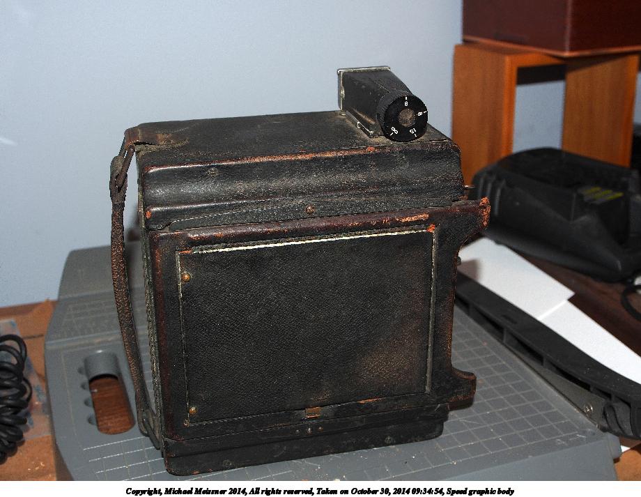 Picture #4: Speed graphic body #4 Thumb: 460x345, 35,775 bytes (35K) Small: 920x713, 119,404 bytes (117K), (html file) Large: 4600x3450, 5,219,281 bytes (5.0M), (html file) Copyright, Michael Meissner 2014, All rights reserved Olympus E-M5-I camera with Olympus-m43 12-50mm f/3.5-6.3 lens f/4.9, ISO 200, flash (+0.33 flash compensation), 1/60 sec, 22.0mm, auto mode, vivid color, matrix metering, IS1 (All Direction Shake IS), noise filter low 35mm equivalent focal length 44.0mm Programs used: crop, raw therapee Taken by Michael Meissner on October 30, 2014 09:34:54 Last modified on November 10, 2014 at 09:30 |