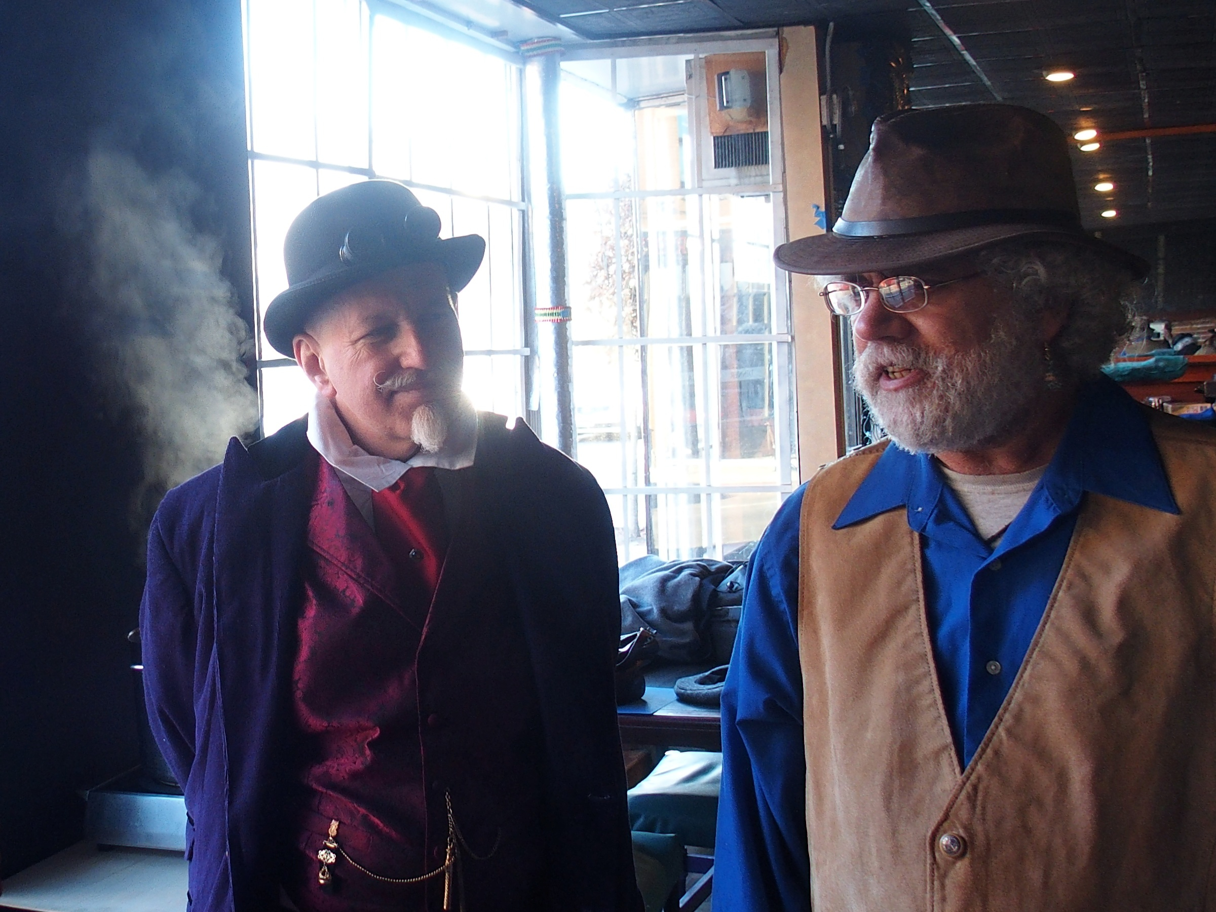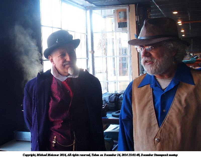 Picture #2: December Steampunk meetup #2 Thumb: 480x360, 48,278 bytes (48K) Small: 800x623, 84,795 bytes (83K), (html file) Large: 2400x1800, 1,988,718 bytes (1.9M), (html file) Copyright, Michael Meissner 2014, All rights reserved Olympus Stylus-1 camera f/2.8, ISO 200, 1/30 sec, 6.0mm, auto mode, vivid color, SHQ, matrix metering, IS Auto, noise reduction auto, noise filter low 35mm equivalent focal length 28.0mm Programs used: crop, rawtherapee Taken by Michael Meissner on December 14, 2014 15:01:48 Last modified on January 01, 2015 at 01:35 |