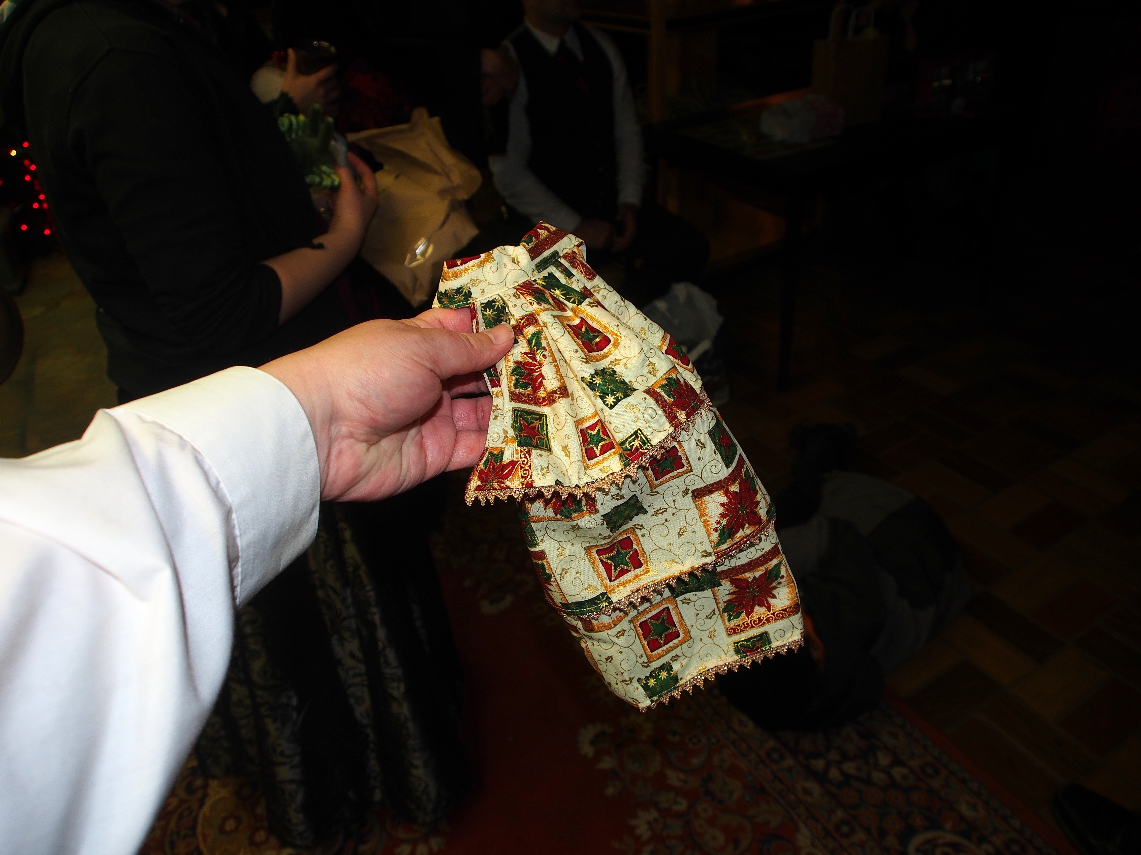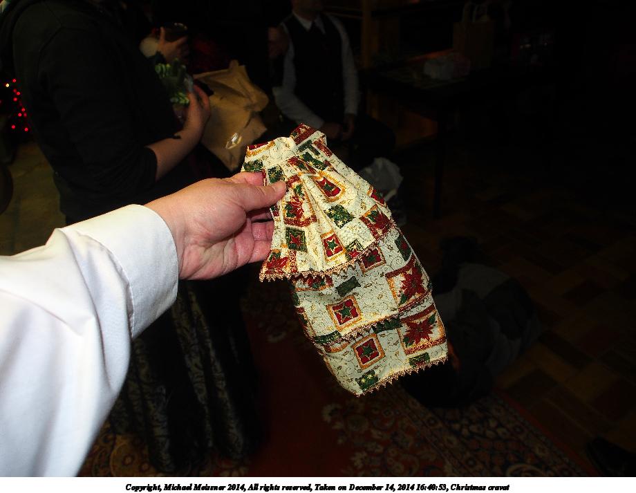 Picture #15: Christmas cravat Thumb: 460x345, 34,149 bytes (34K) Small: 920x713, 88,279 bytes (87K), (html file) Large: 4600x3450, 3,123,285 bytes (3.0M), (html file) Copyright, Michael Meissner 2014, All rights reserved Olympus E-M5-I camera with Olympus-m43 12-50mm f/3.5-6.3 lens f/3.5, ISO 200, flash (+0.33 flash compensation), 1/60 sec, 12.0mm, auto mode, vivid color, matrix metering, IS1 (All Direction Shake IS), noise filter low 35mm equivalent focal length 24.0mm Programs used: crop, raw therapee Taken by Michael Meissner on December 14, 2014 16:40:53 Last modified on January 01, 2015 at 01:41 |