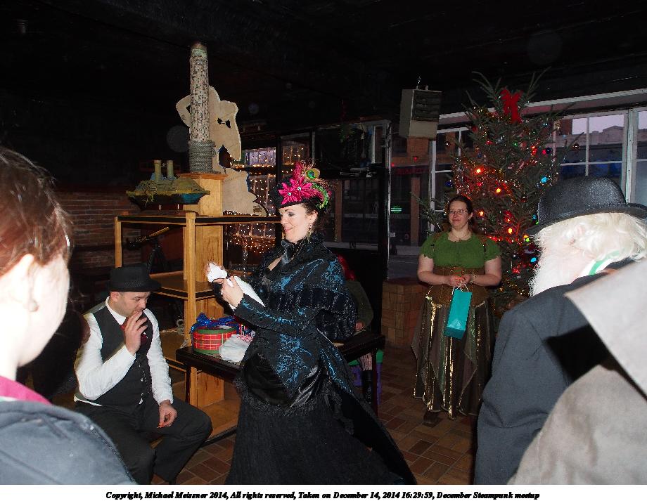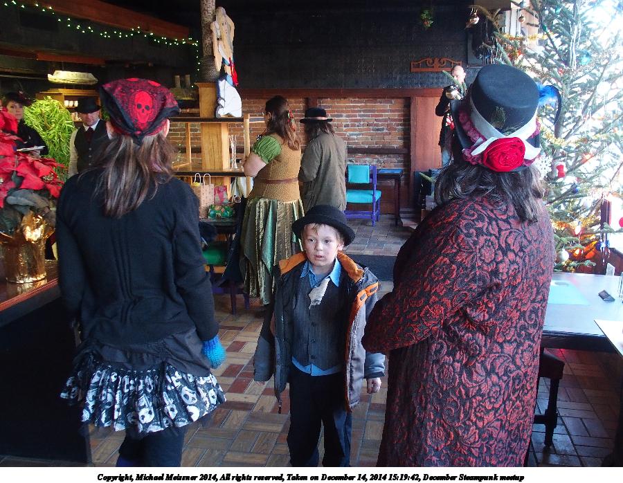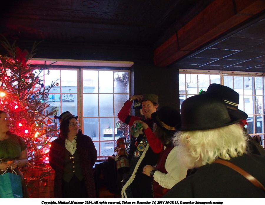 Picture #4: December Steampunk meetup #4 Thumb: 450x338, 54,639 bytes (54K) Small: 900x698, 162,285 bytes (159K), (html file) Large: 3600x2700, 3,318,520 bytes (3.2M), (html file) Copyright, Michael Meissner 2014, All rights reserved Olympus Stylus-1 camera f/2.8, ISO 640, 1/30 sec, 6.7mm, auto mode, vivid color, SHQ, matrix metering, IS Auto, noise reduction auto, noise filter low 35mm equivalent focal length 32.0mm Programs used: crop, raw therapee Taken by Michael Meissner on December 14, 2014 15:19:42 Last modified on January 01, 2015 at 01:36 |