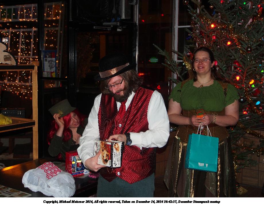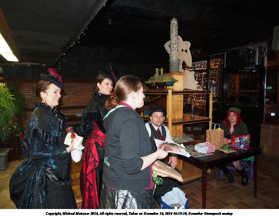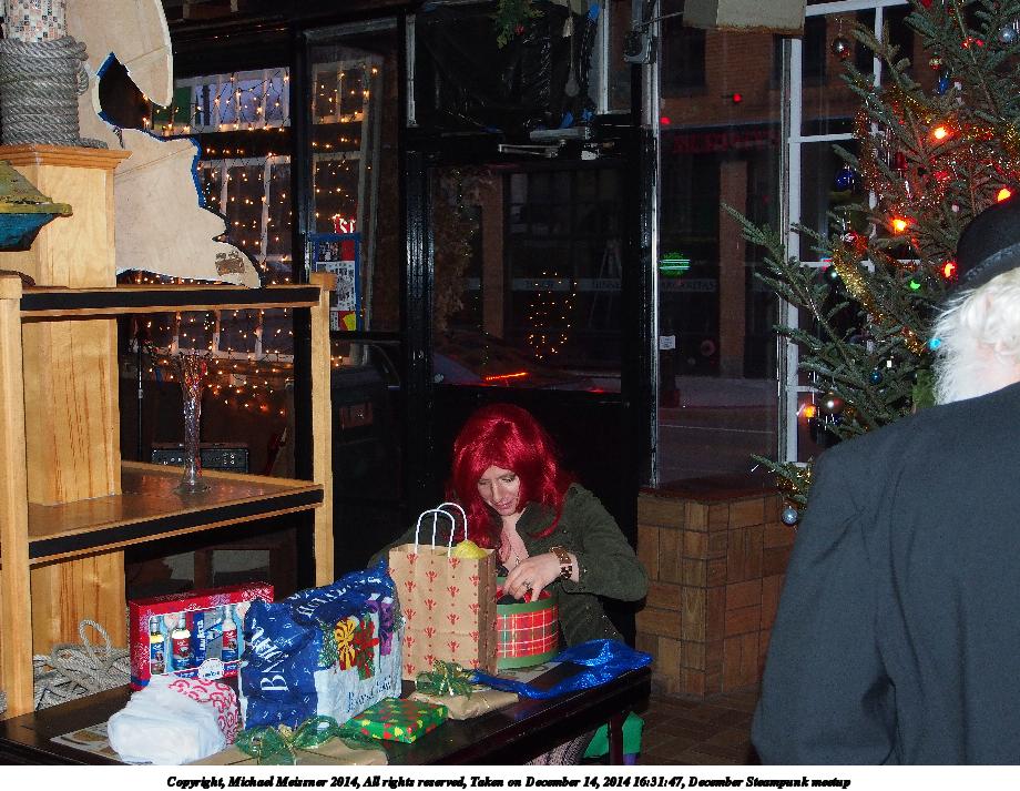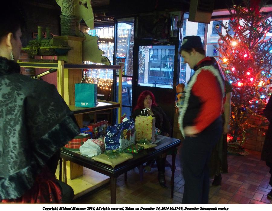Picture #8: December Steampunk meetup #7 Thumb: 450x338, 43,708 bytes (43K) Small: 900x698, 111,058 bytes (109K), (html file) Large: 3600x2700, 2,426,888 bytes (2.3M), (html file) Copyright, Michael Meissner 2014, All rights reserved Olympus Stylus-1 camera f/2.8, ISO 800, 1/8 sec, 6.0mm, auto mode, vivid color, SHQ, matrix metering, IS Auto, noise reduction auto, noise filter low 35mm equivalent focal length 28.0mm Programs used: crop, raw therapee Taken by Michael Meissner on December 14, 2014 16:28:19 Last modified on January 01, 2015 at 01:37 |