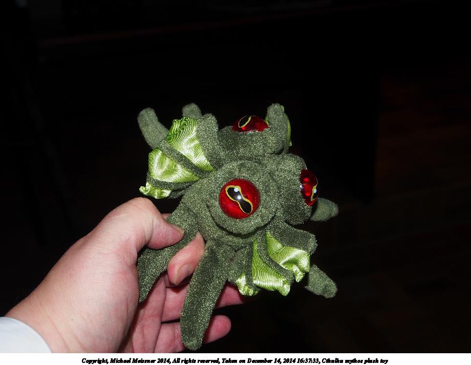 Picture #11: Cthulhu mythos plush toy Thumb: 460x345, 28,652 bytes (28K) Small: 920x713, 87,606 bytes (86K), (html file) Large: 4600x3450, 3,227,129 bytes (3.1M), (html file) Copyright, Michael Meissner 2014, All rights reserved Olympus E-M5-I camera with Olympus-m43 12-50mm f/3.5-6.3 lens f/5.1, ISO 200, flash (+0.33 flash compensation), 1/60 sec, 25.0mm, auto mode, vivid color, matrix metering, IS1 (All Direction Shake IS), noise filter low 35mm equivalent focal length 50.0mm Programs used: crop, raw therapee Taken by Michael Meissner on December 14, 2014 16:37:33 Last modified on January 01, 2015 at 01:39 |