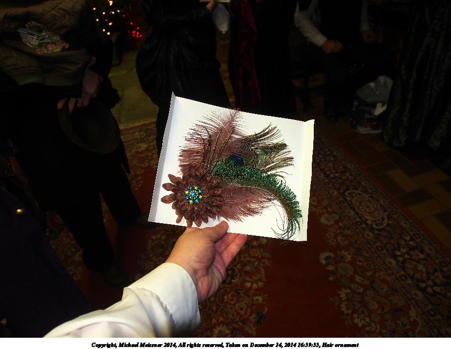 Picture #13: Hair ornament Thumb: 460x345, 35,009 bytes (35K) Small: 920x713, 91,259 bytes (90K), (html file) Large: 4600x3450, 3,121,943 bytes (3.0M), (html file) Copyright, Michael Meissner 2014, All rights reserved Olympus E-M5-I camera with Olympus-m43 12-50mm f/3.5-6.3 lens f/3.5, ISO 200, flash (+0.33 flash compensation), 1/60 sec, 12.0mm, auto mode, vivid color, matrix metering, IS1 (All Direction Shake IS), noise filter low 35mm equivalent focal length 24.0mm Programs used: crop, raw therapee Taken by Michael Meissner on December 14, 2014 16:39:33 Last modified on January 01, 2015 at 01:40 |